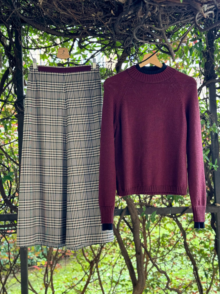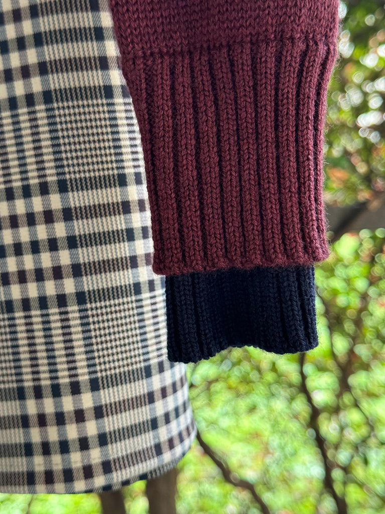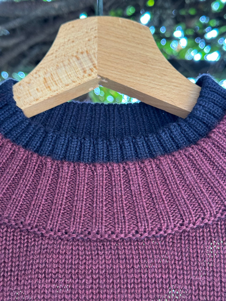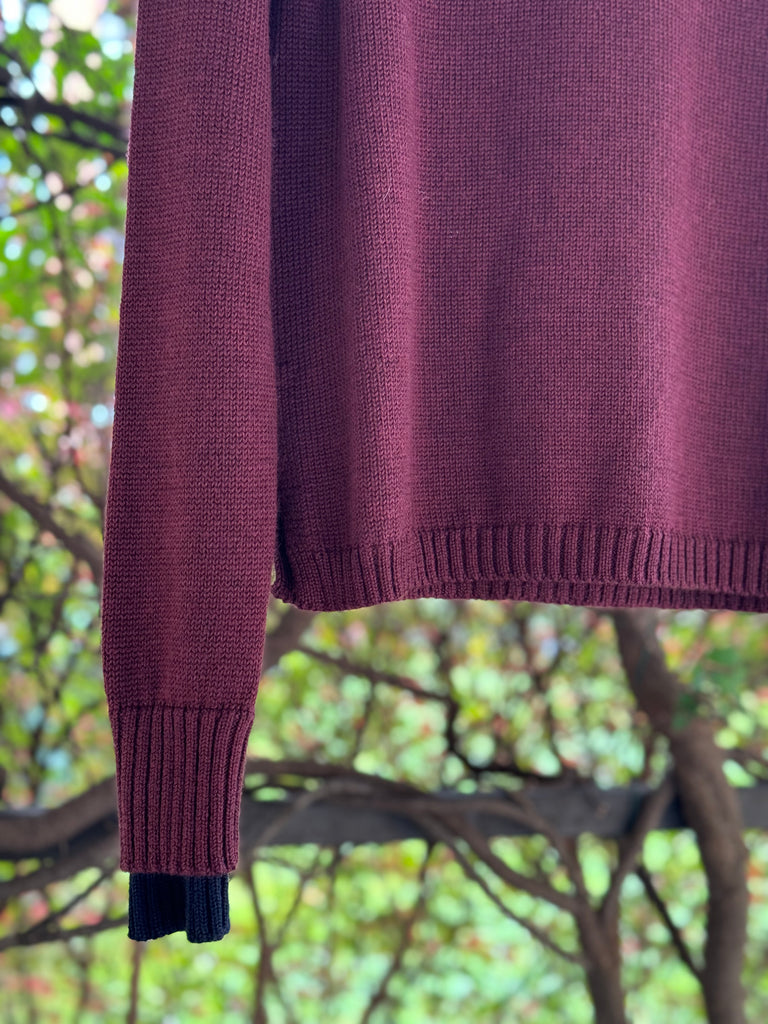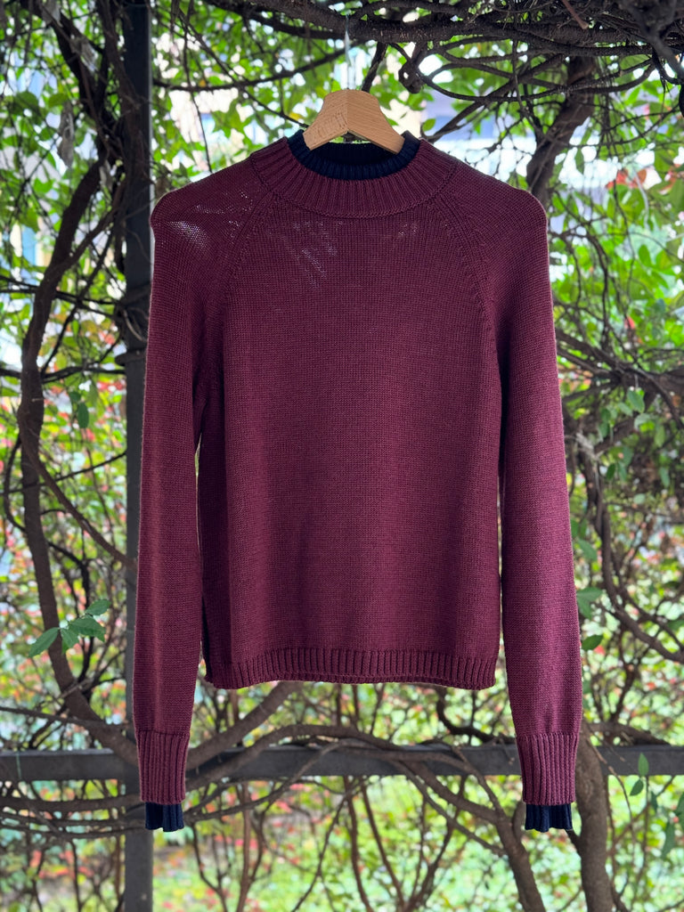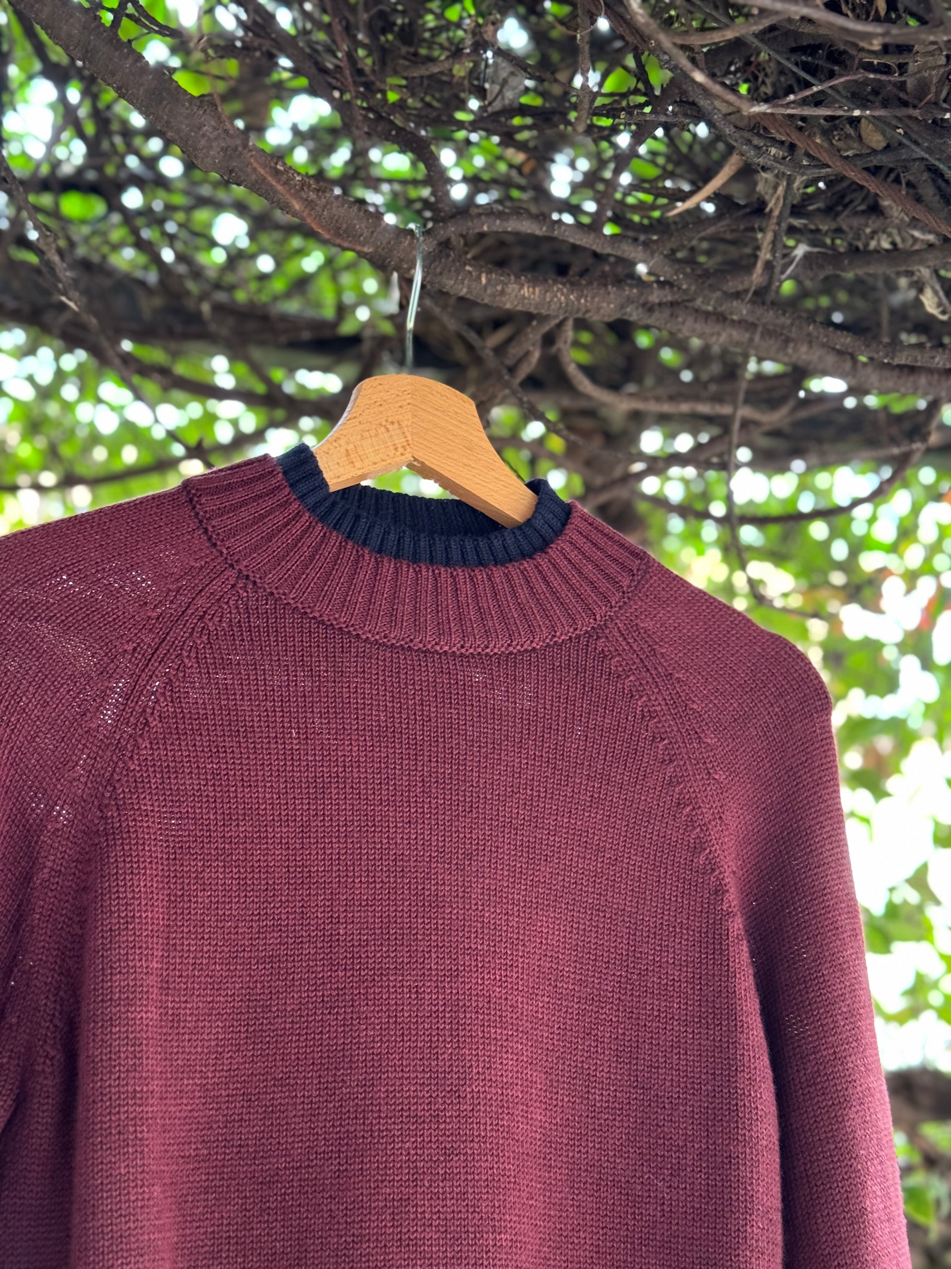 Maglia a girocollo in lana merinos, dal taglio dritto, con doppio polsino e scollo a due colori bordeaux e blue scuro