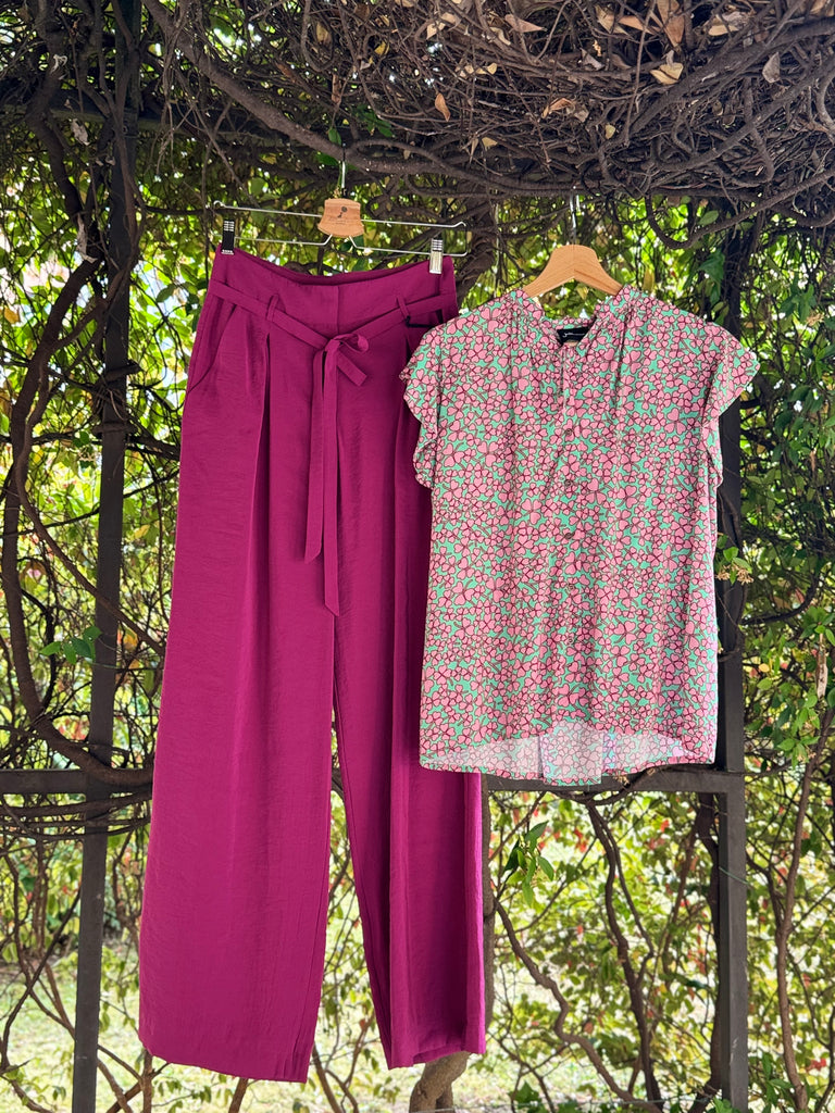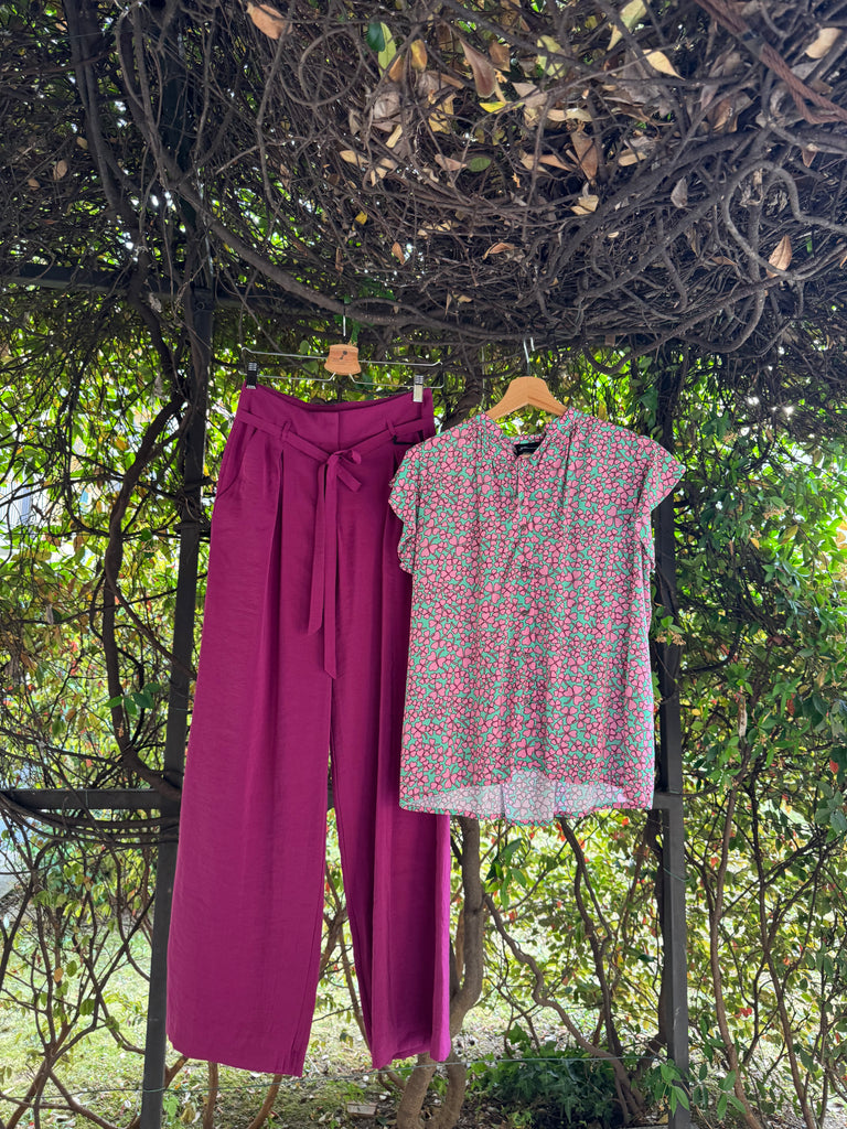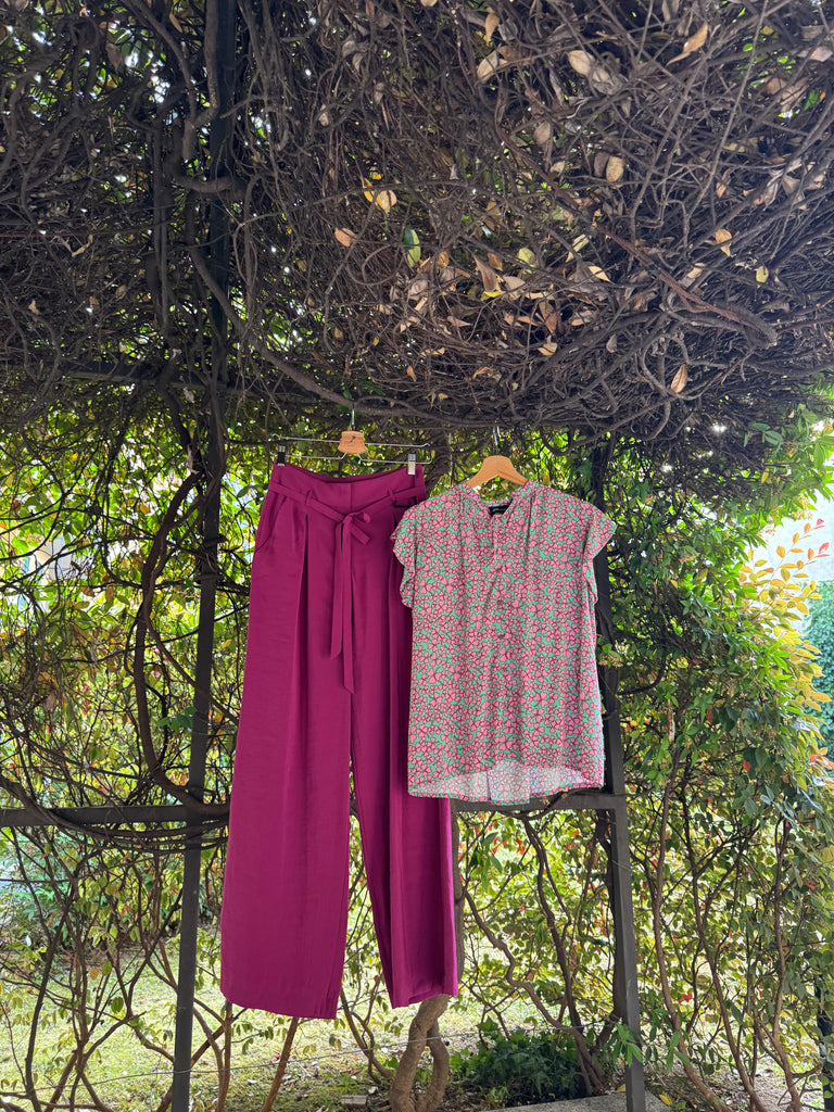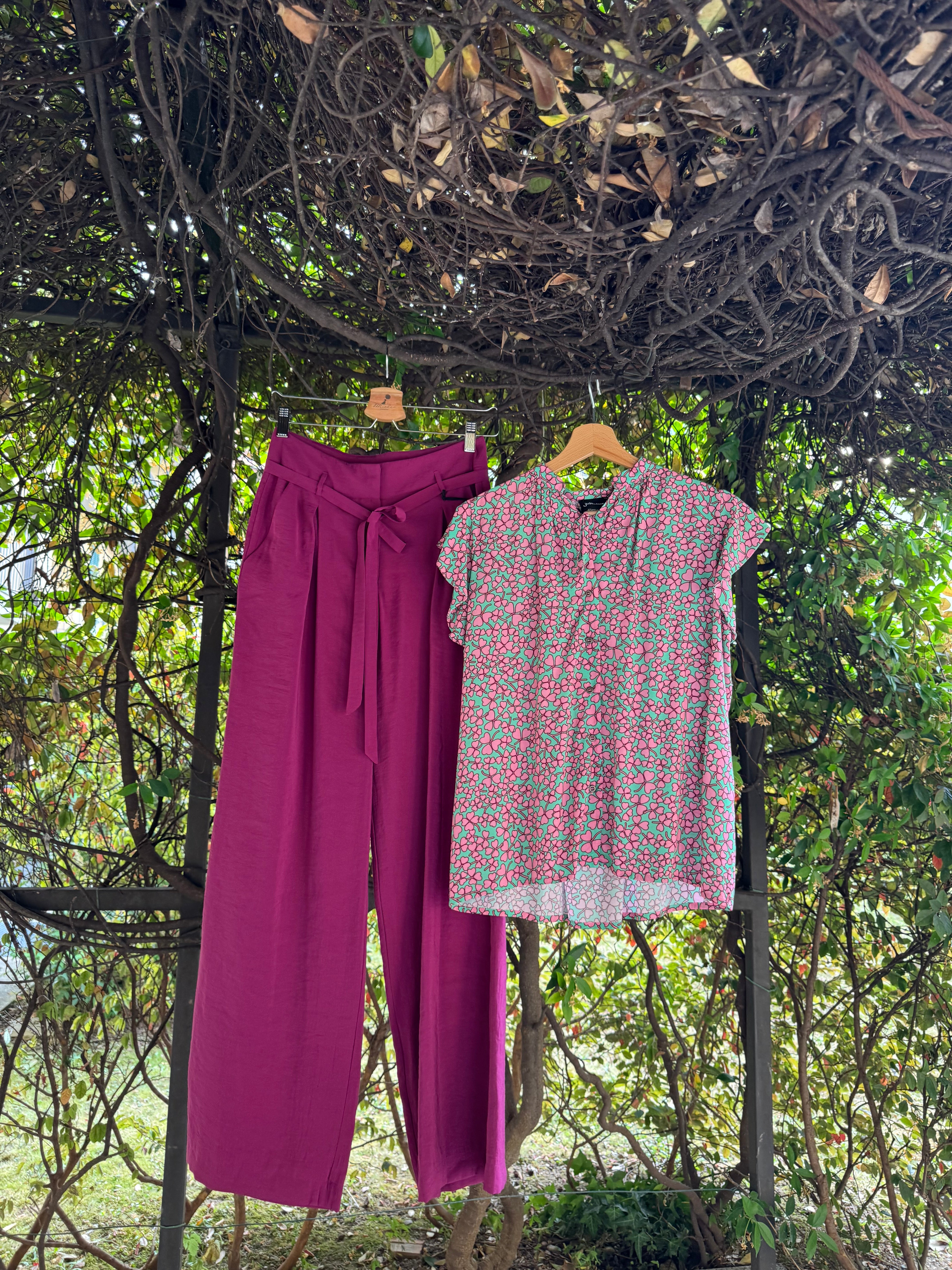 Pantaloni ampi a palazzo in leggero tessuto di viscosa, a vita alta con cinturina in vita, pences piatte, tasche laterali Made in Italy
