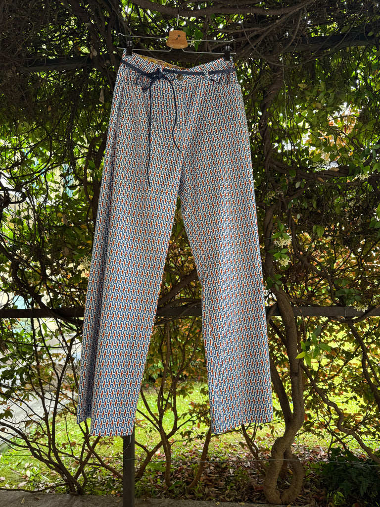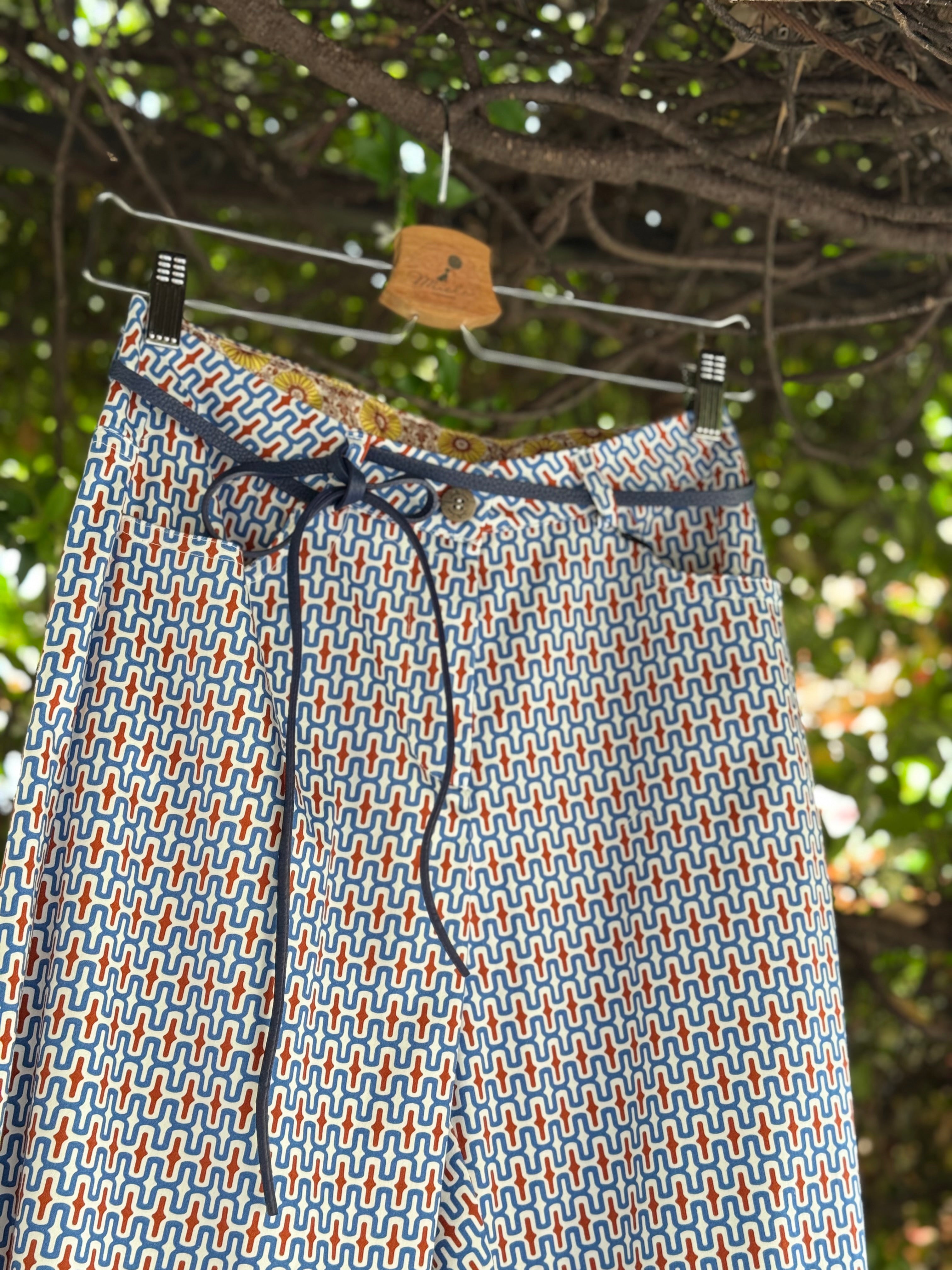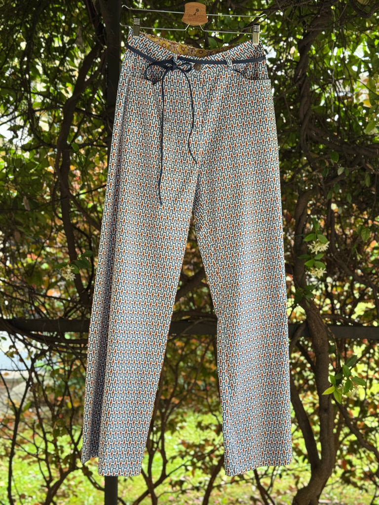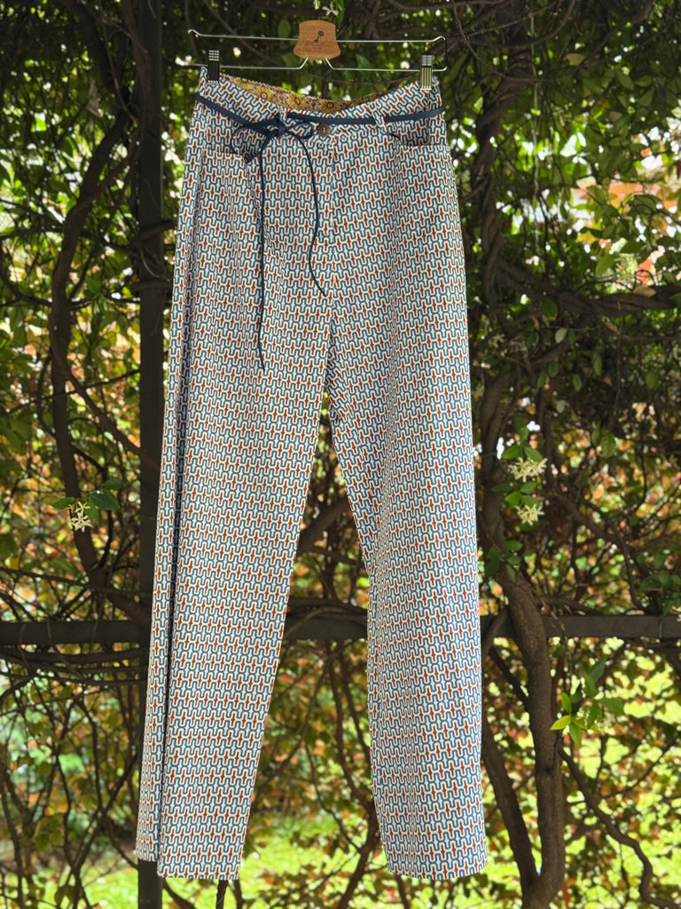 Pantaloni modello cinque tasche a palazzo in cotone stretch stampato, gamba svasata