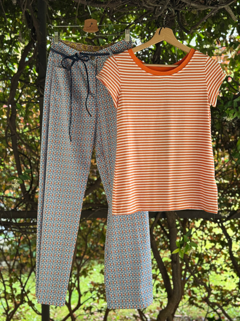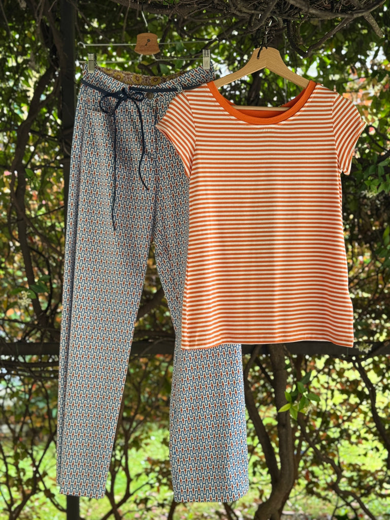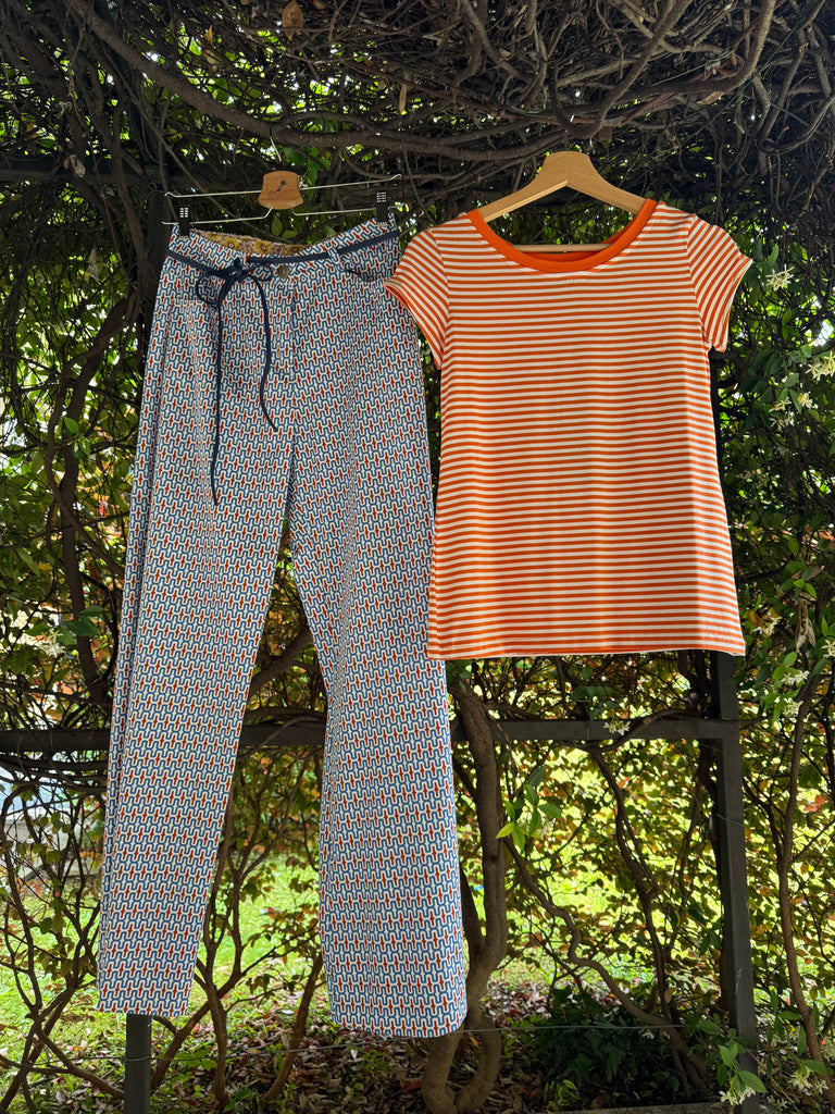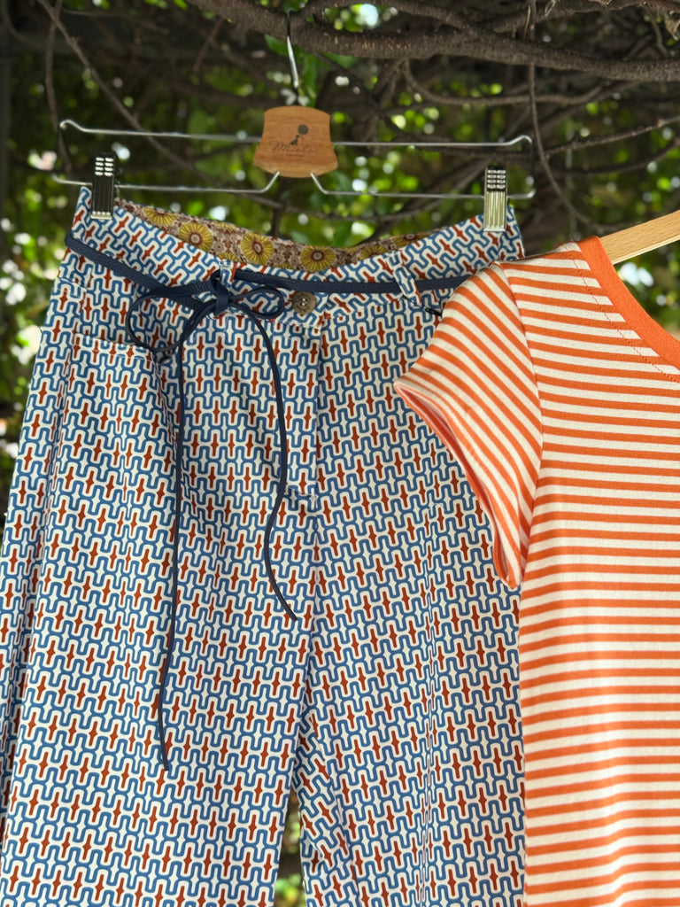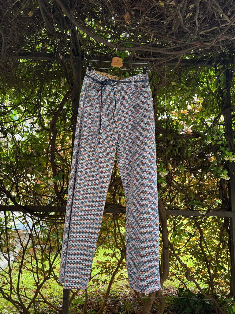 Pantaloni modello cinque tasche a palazzo in cotone stretch stampato, gamba svasata