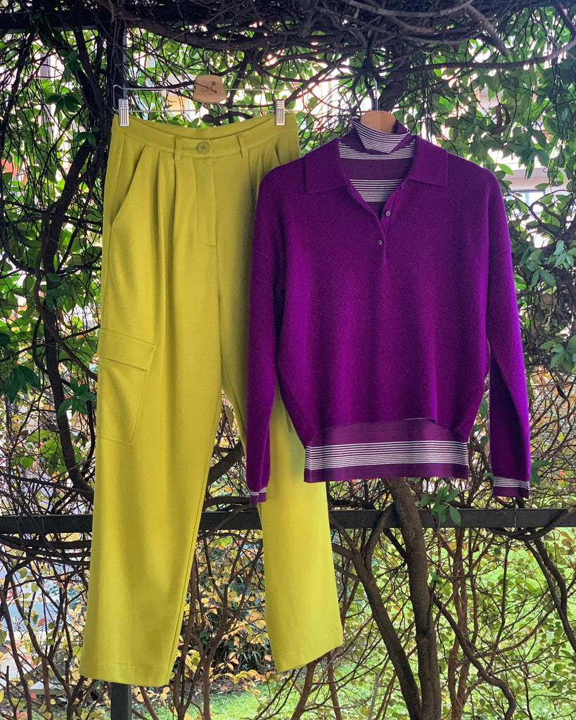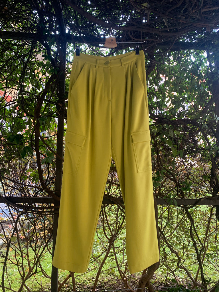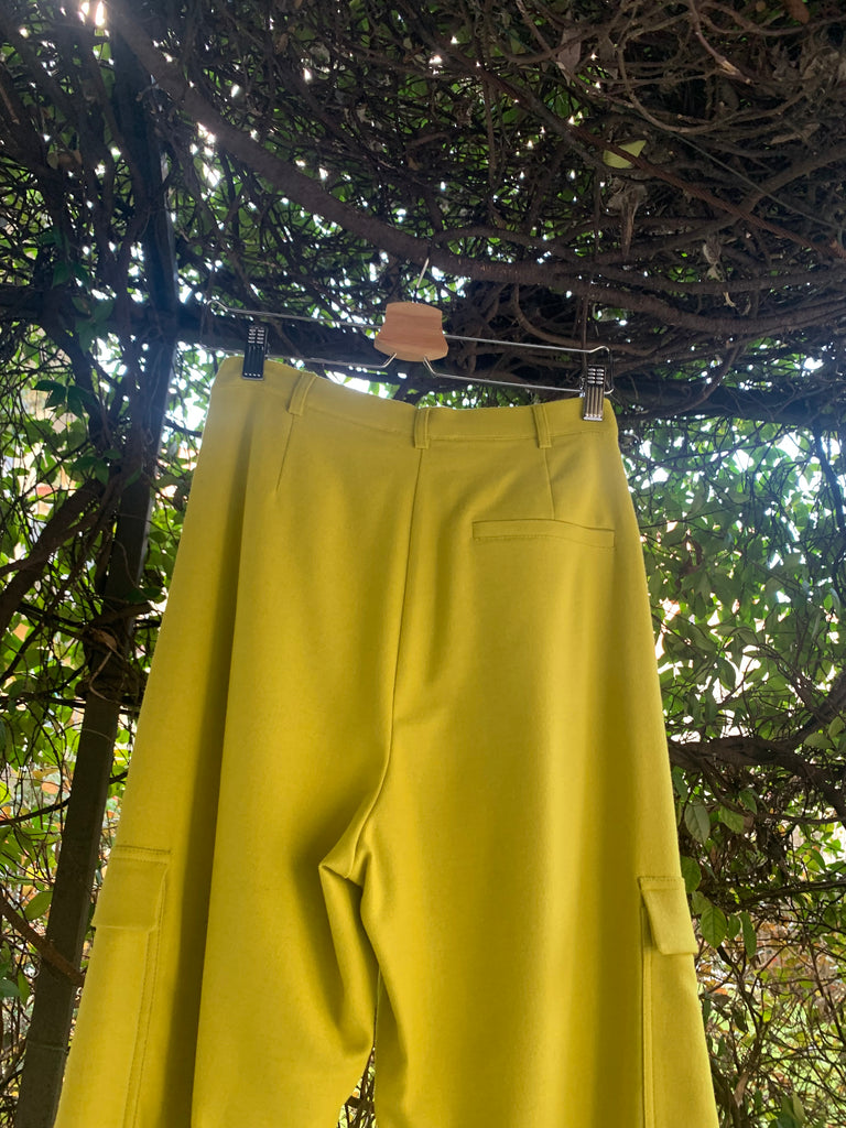 Pantaloni modello cargo con tasche laterali, in panno di lana e viscosa, morbidissimo in color giallo lime