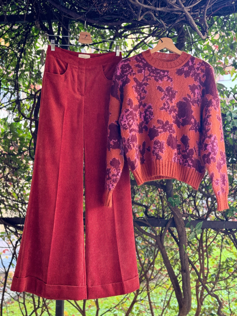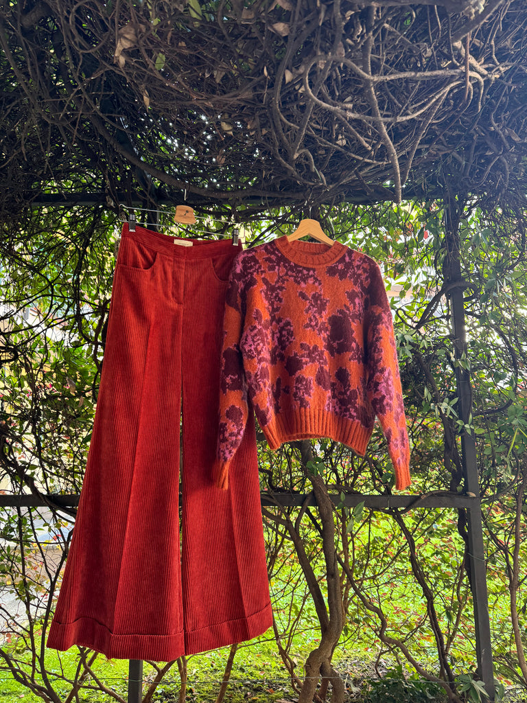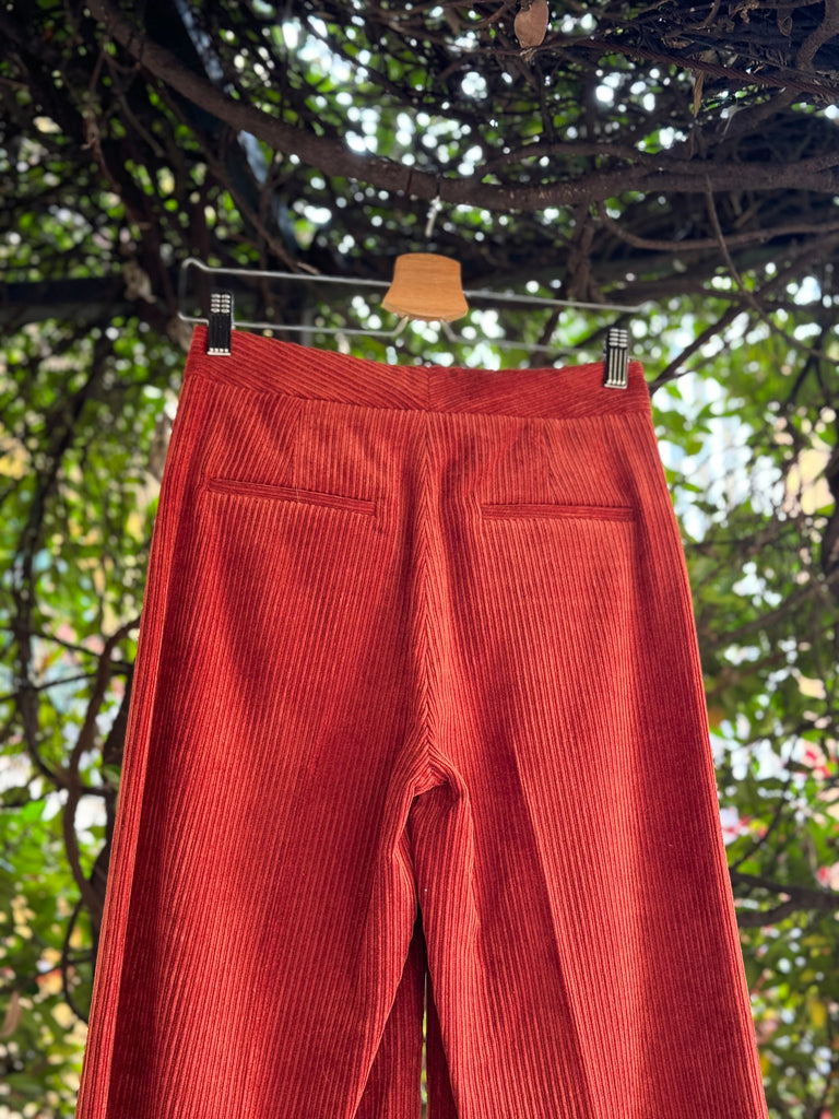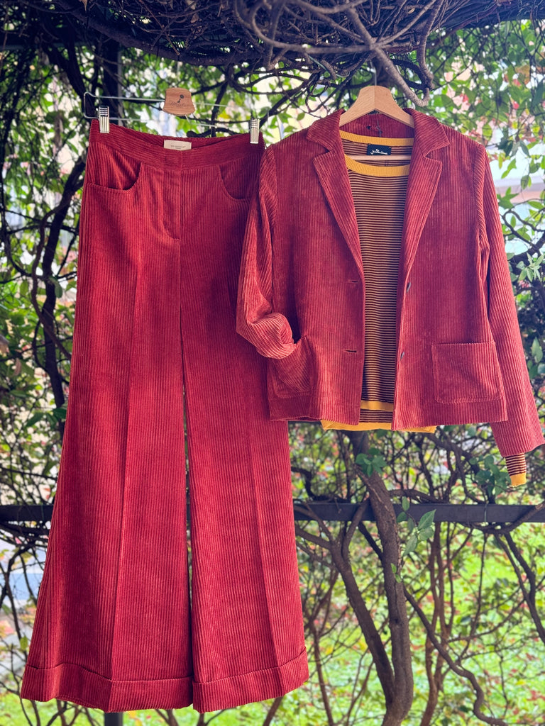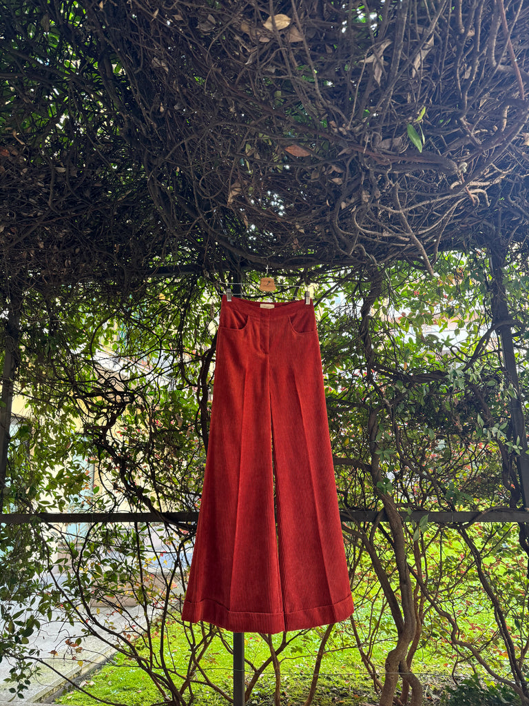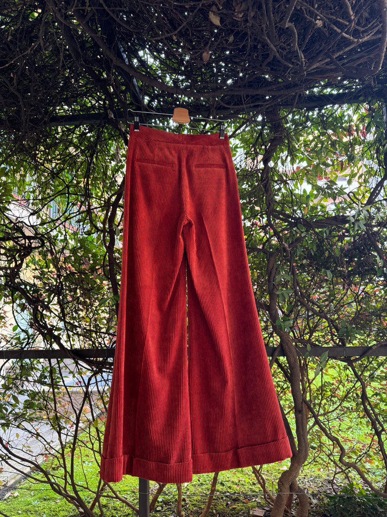 Pantaloni in velluto stretch, a gamba larga, modello a ventaglio, con tasche laterali e a soffietto nella parte posteriore