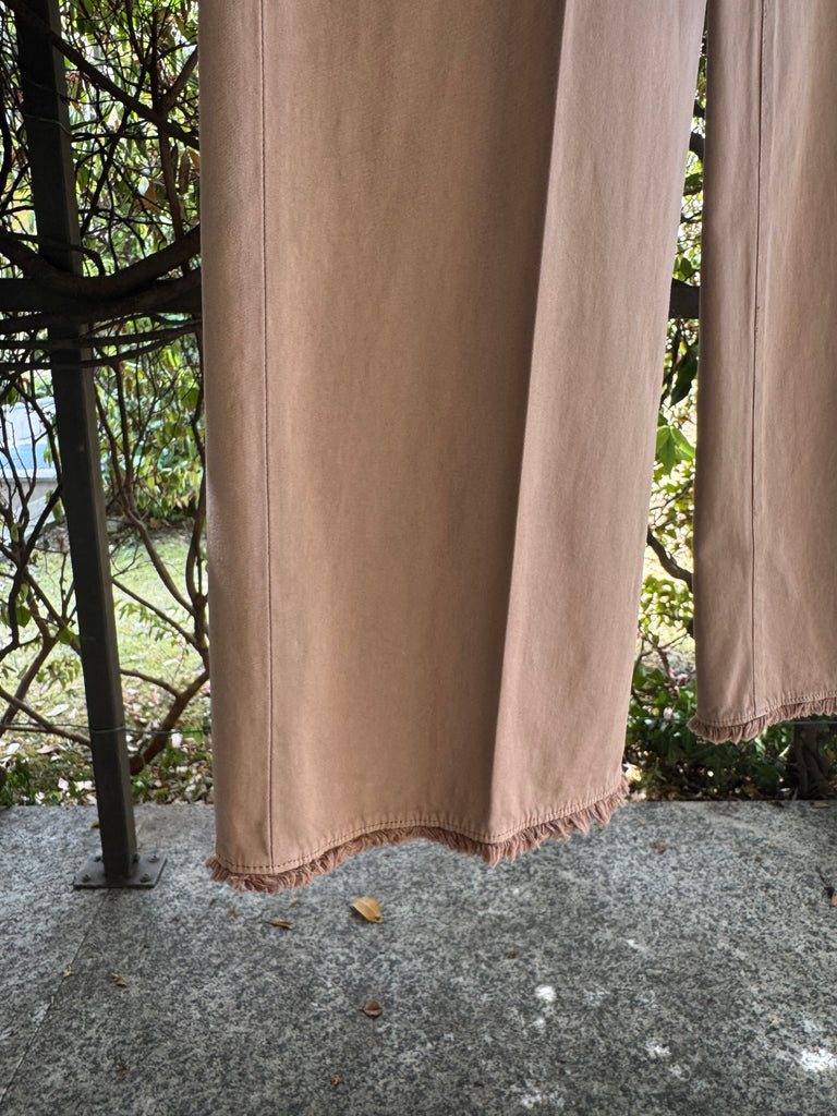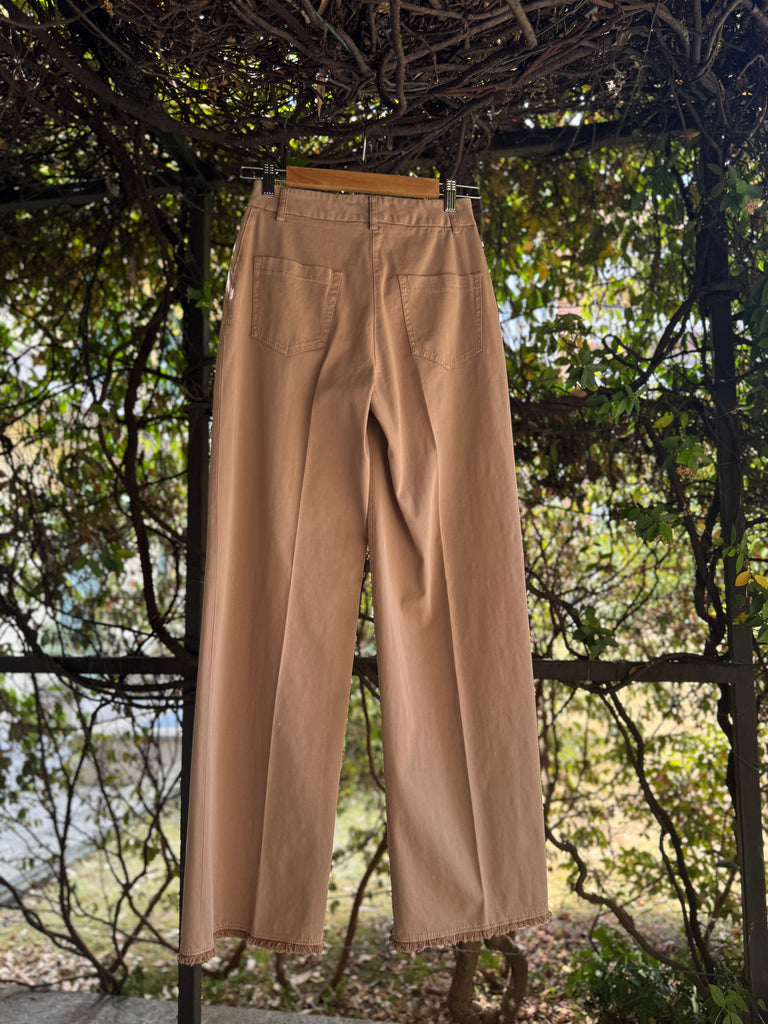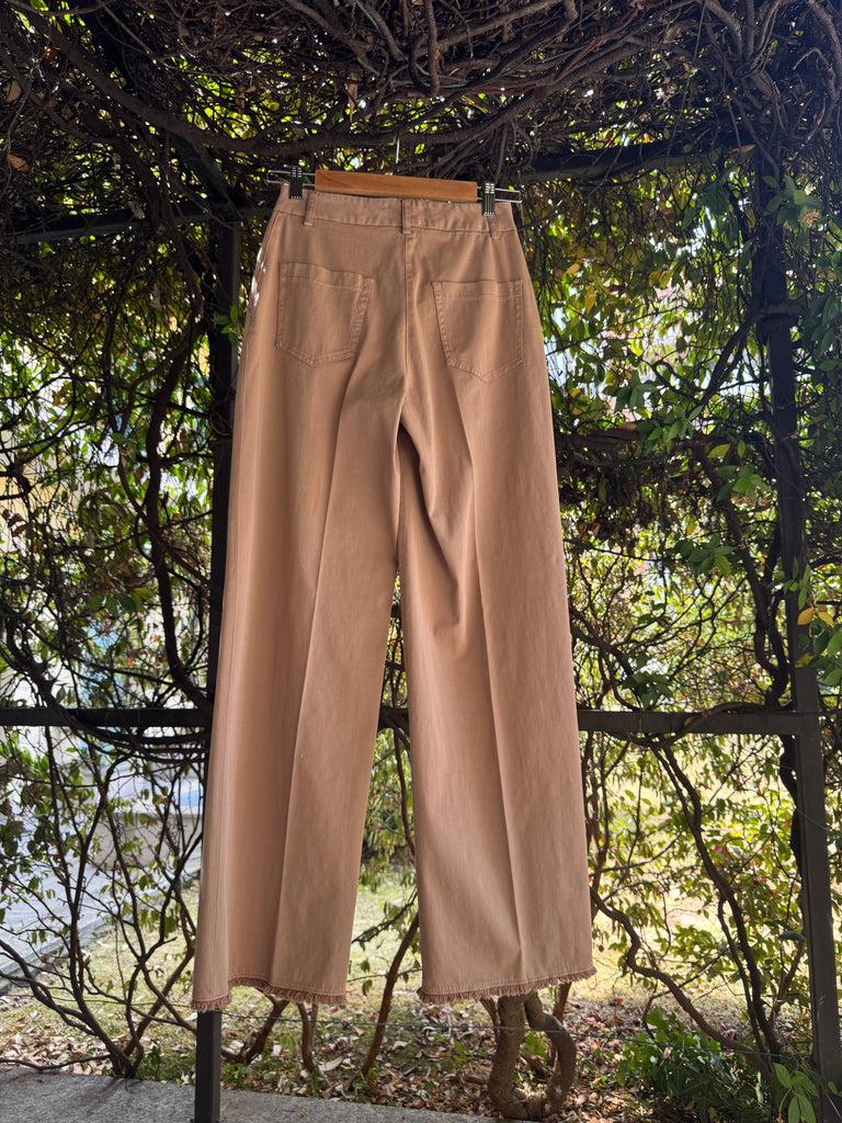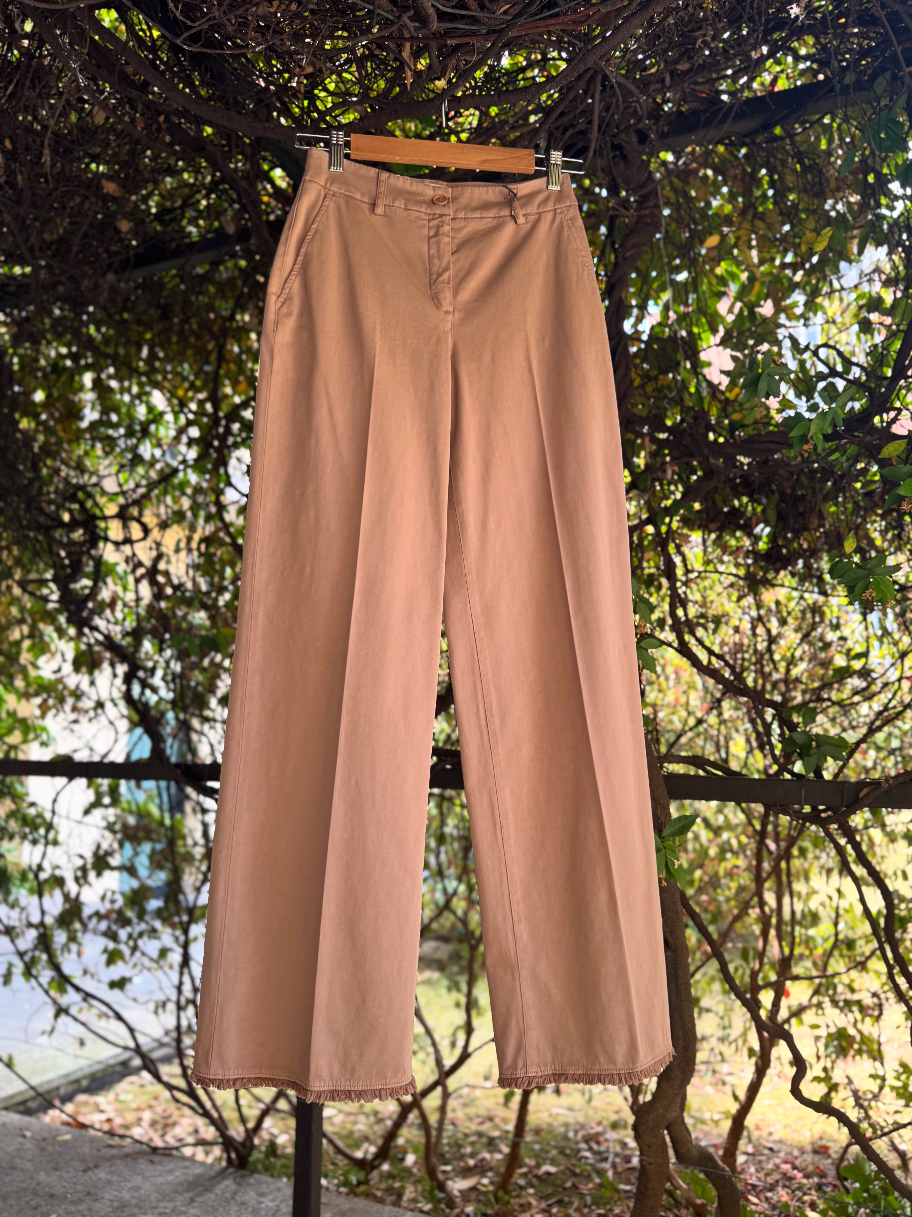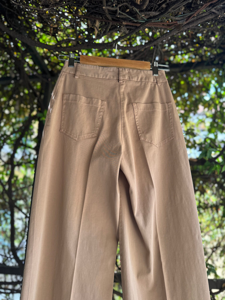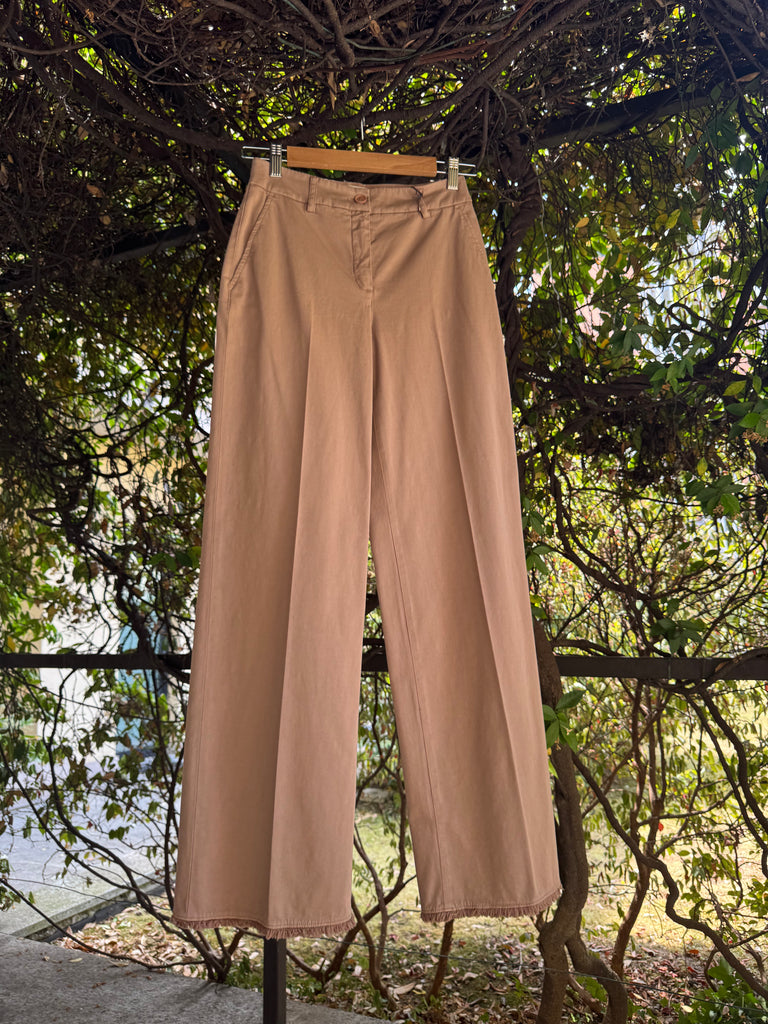 Pantaloni in cotone stretch estivo, modello 5 tasche, gamba larga a palazzo con cimosa ferma a vista sul fondo. Made in Italy