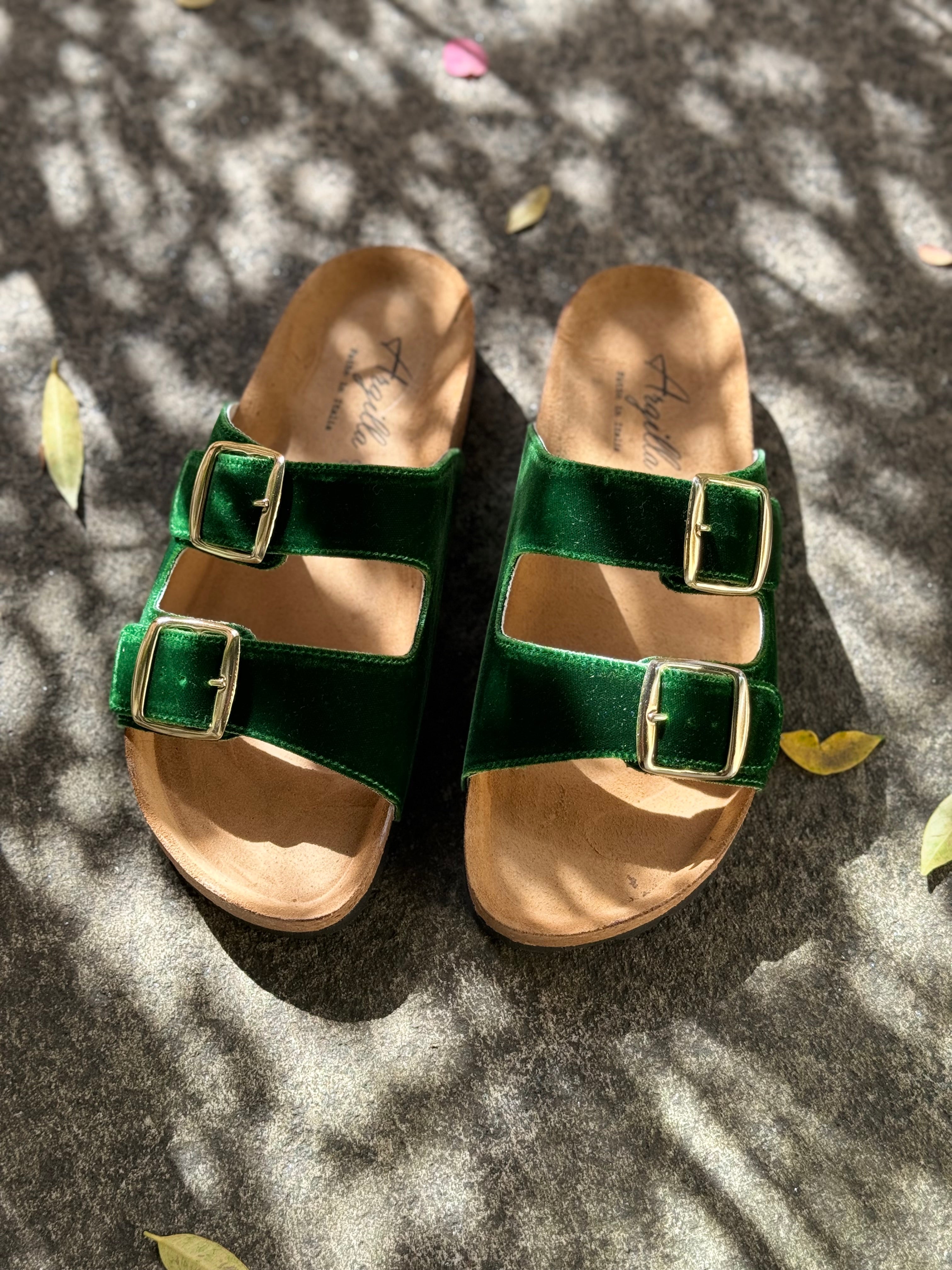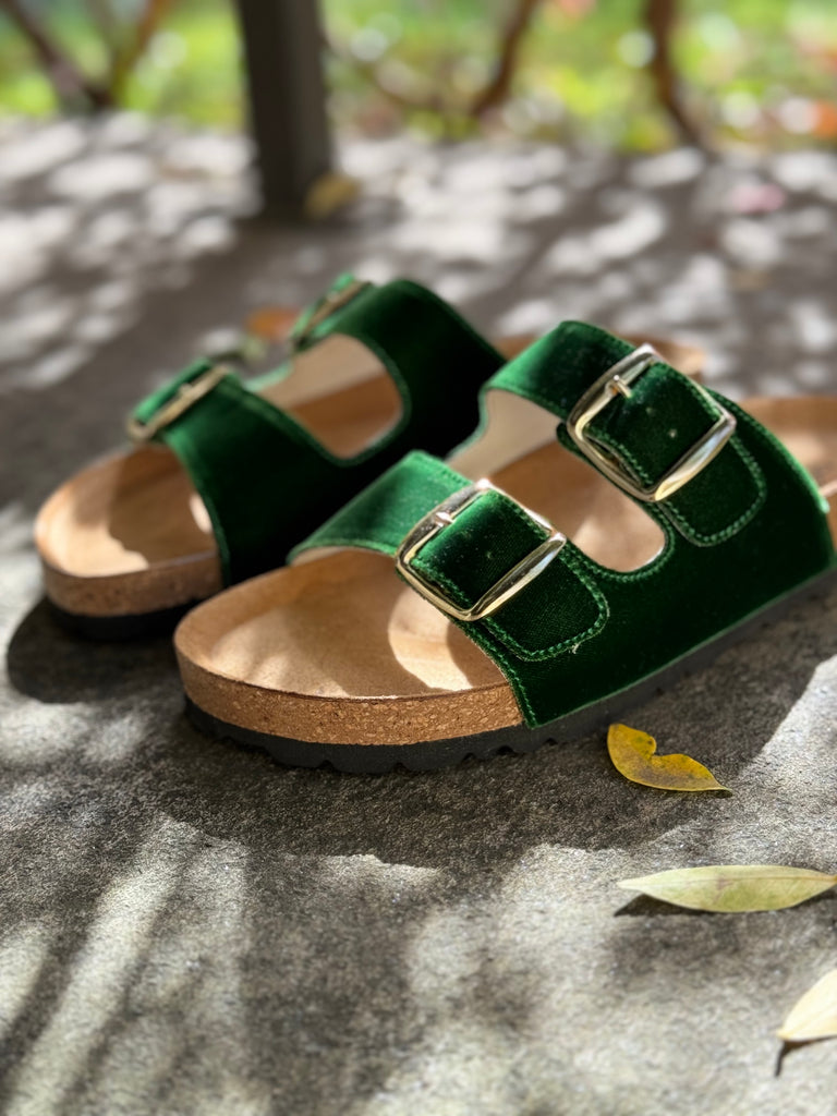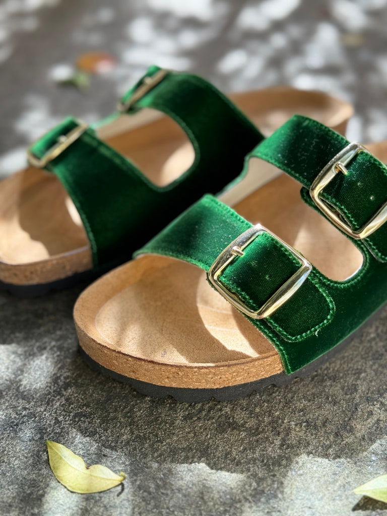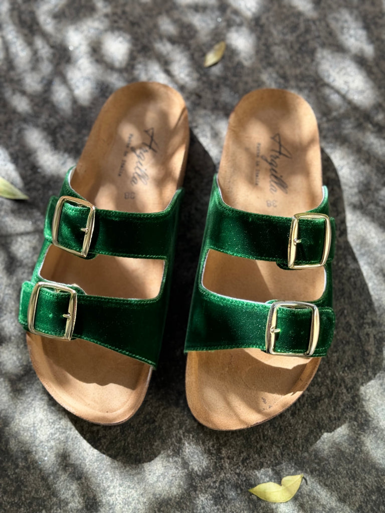 Ciabattine modello Birkenstock in velluto verde oliva, con chiusura regolabile, plantare anatomico