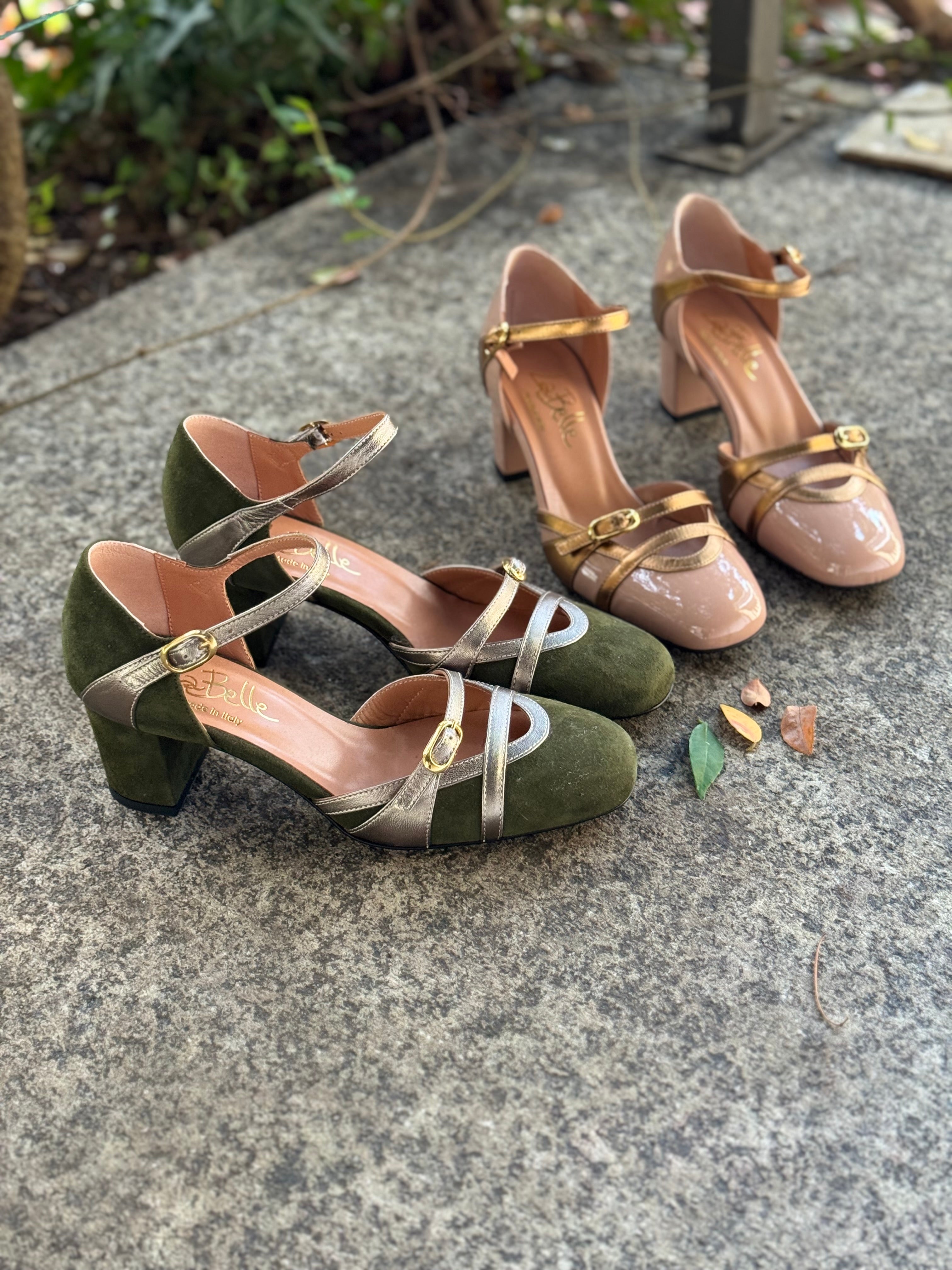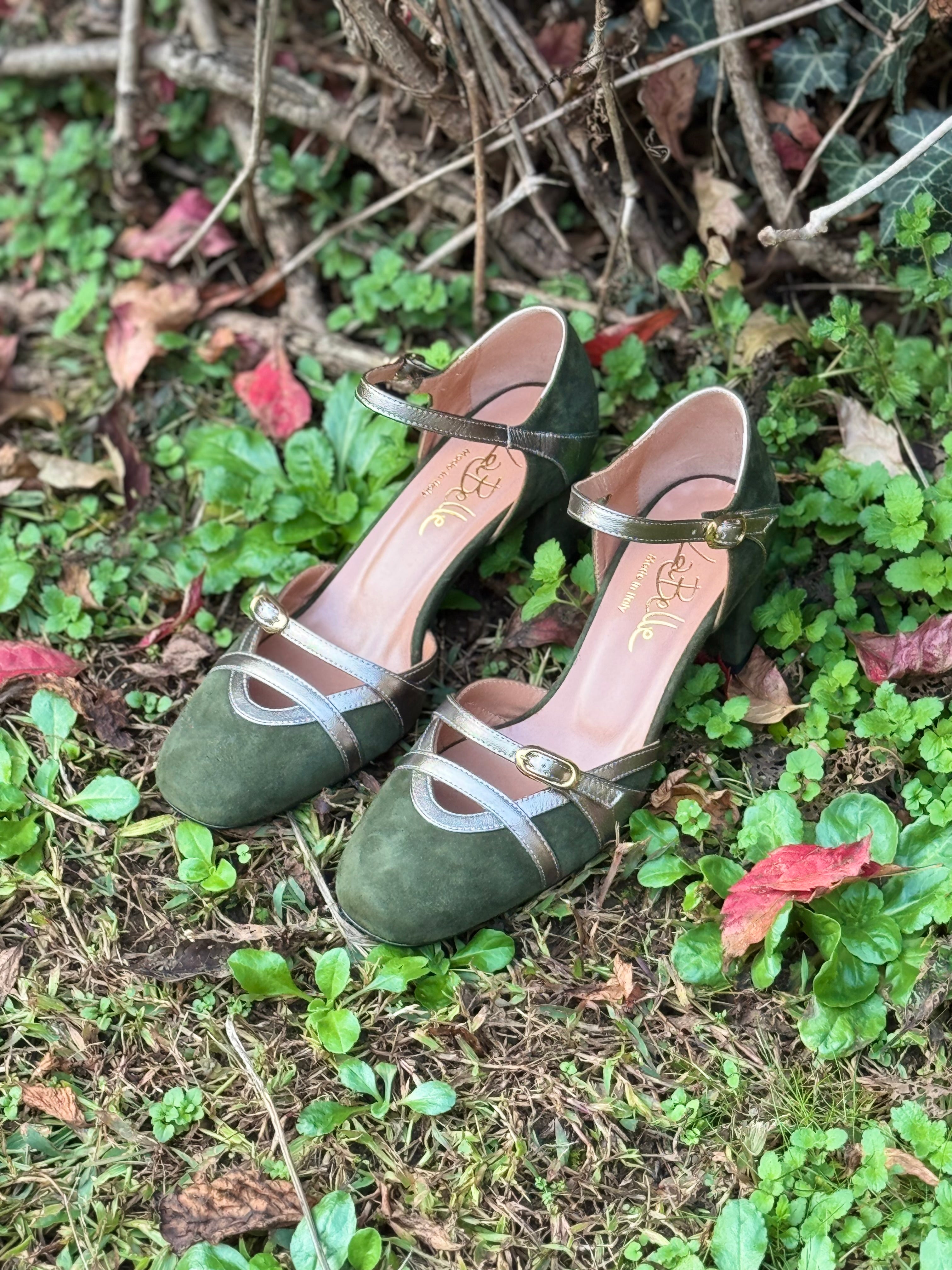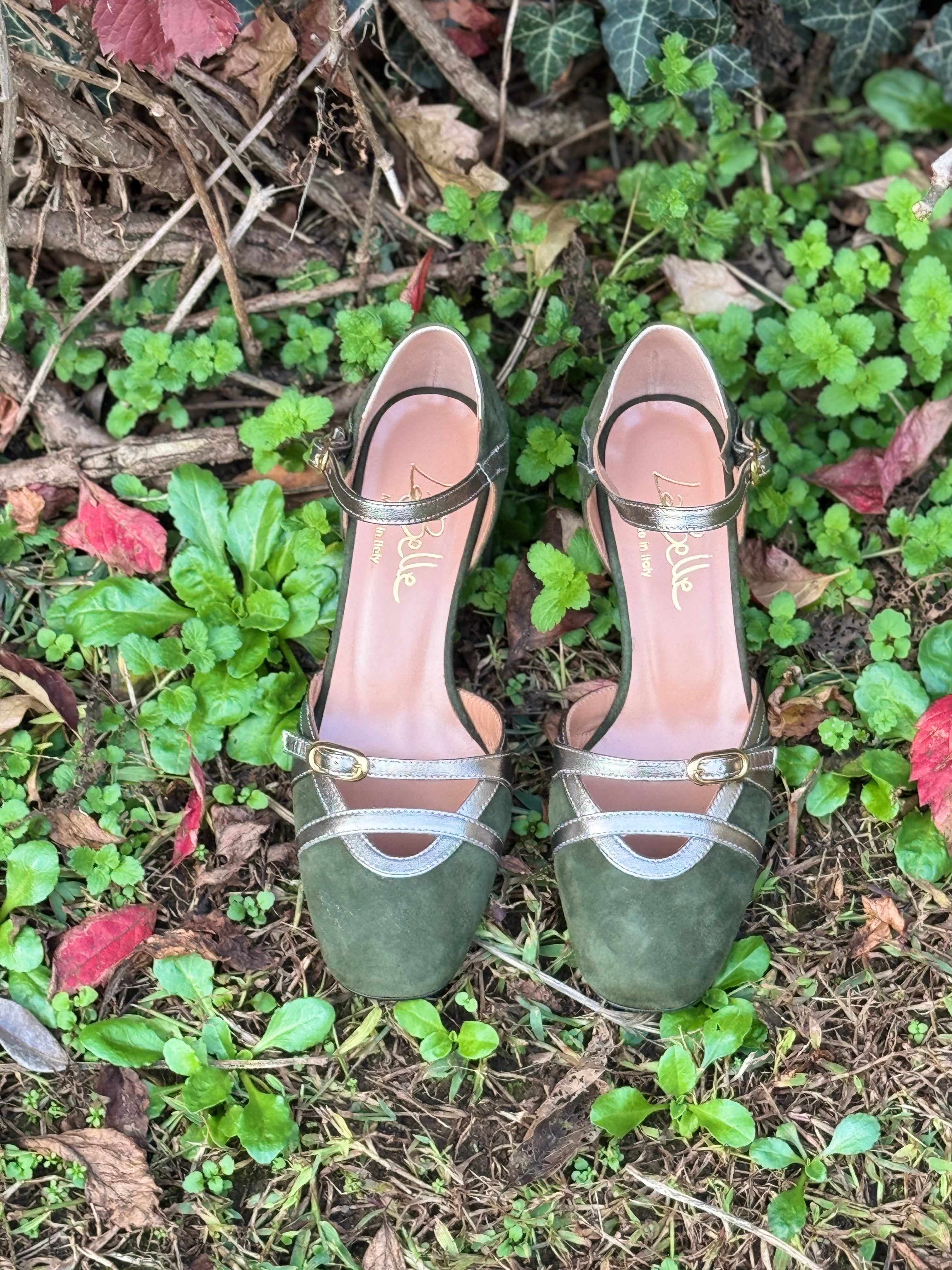 Scarpe décolleté in vera pelle e camoscio, con cinturino alla caviglia, suola in vero cuoio, con protezione in gomma sull’avampiede