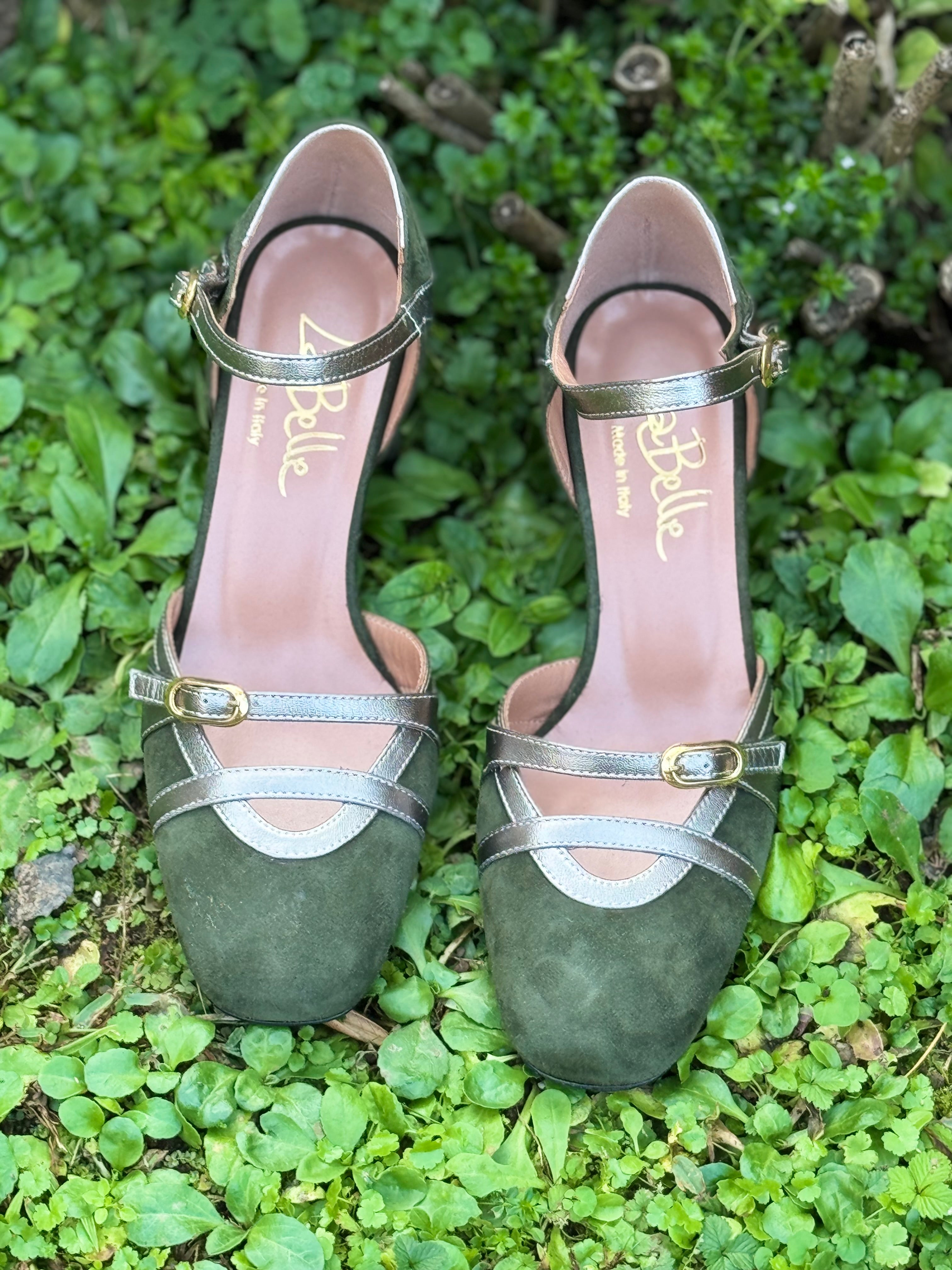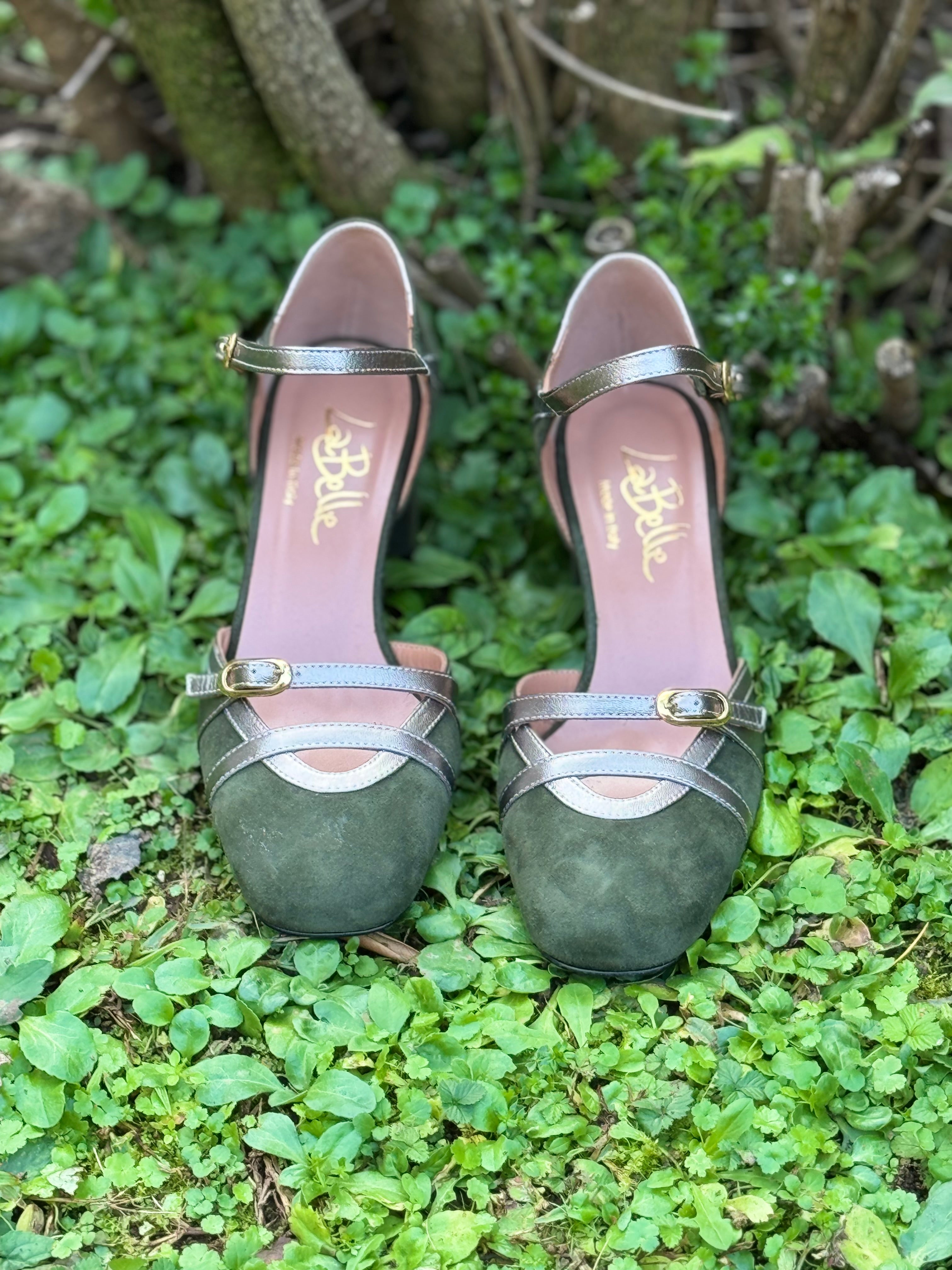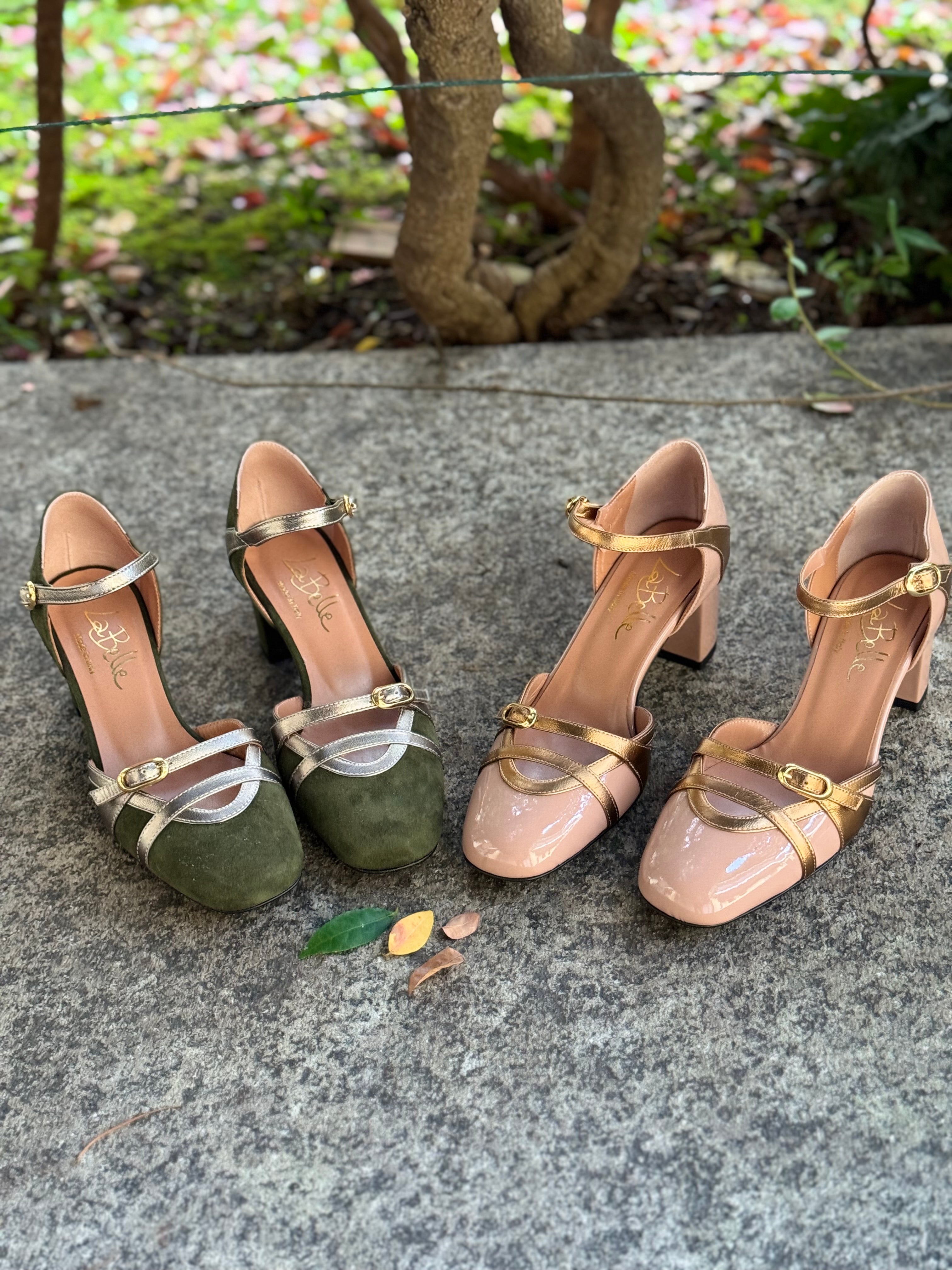 Scarpe décolleté in vera pelle e camoscio, con cinturino alla caviglia, suola in vero cuoio, con protezione in gomma sull’avampiede