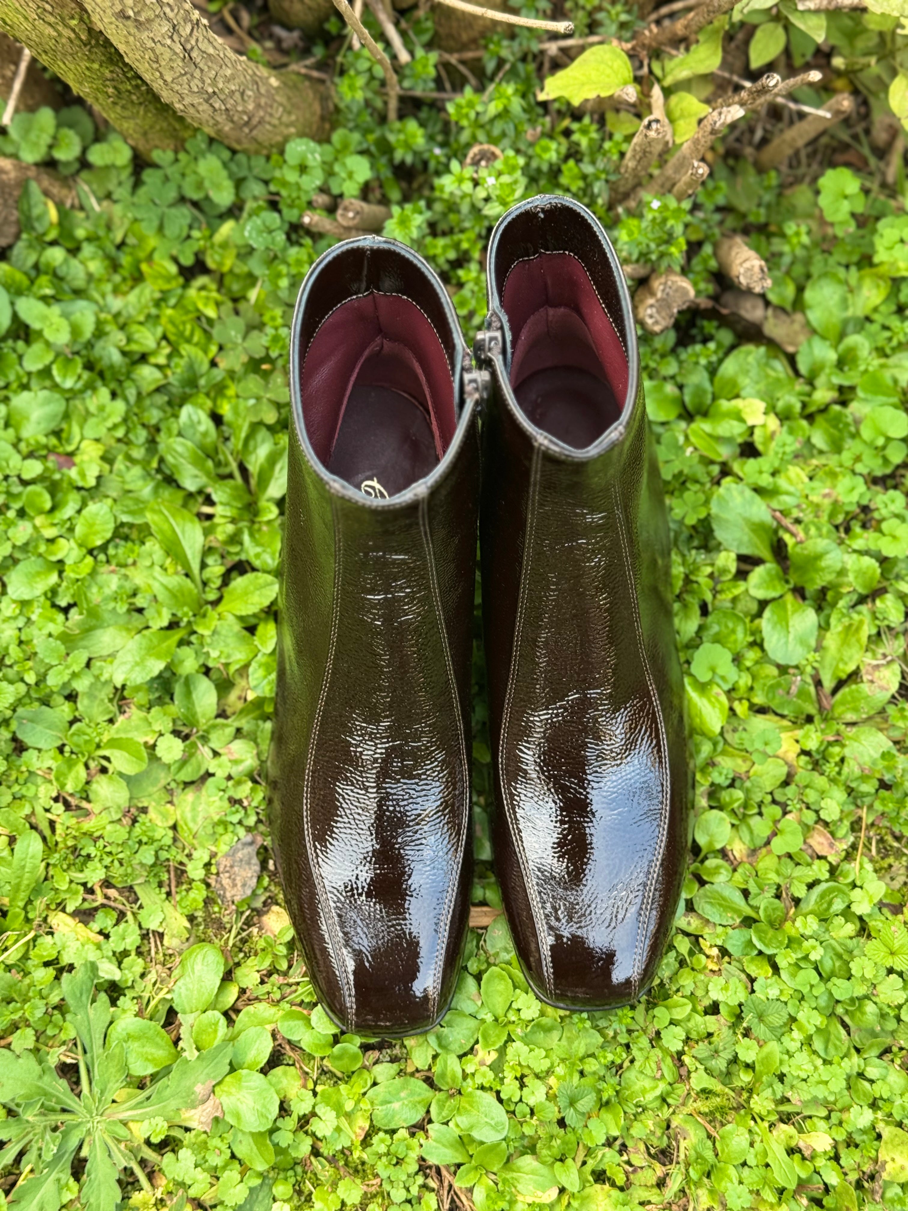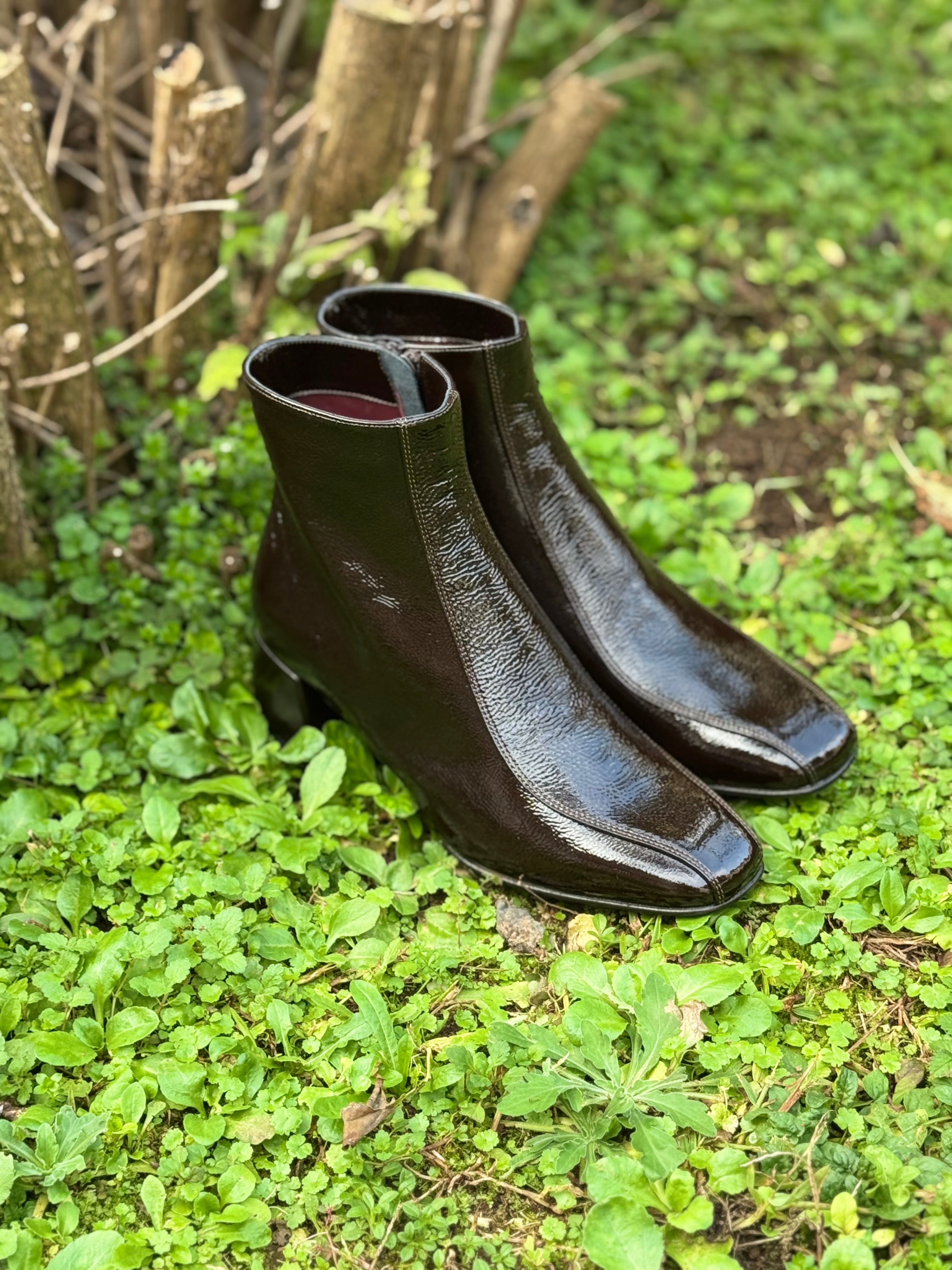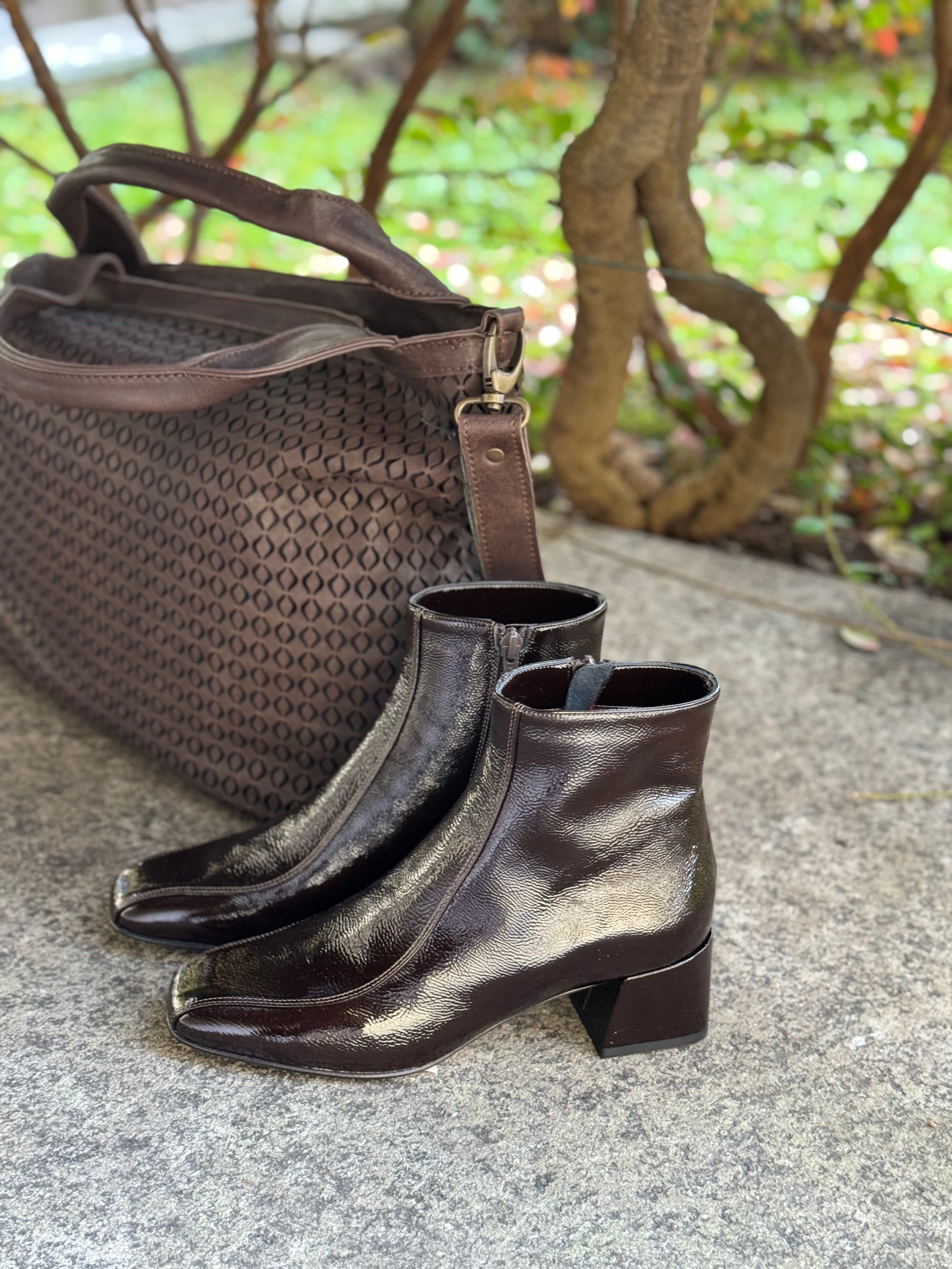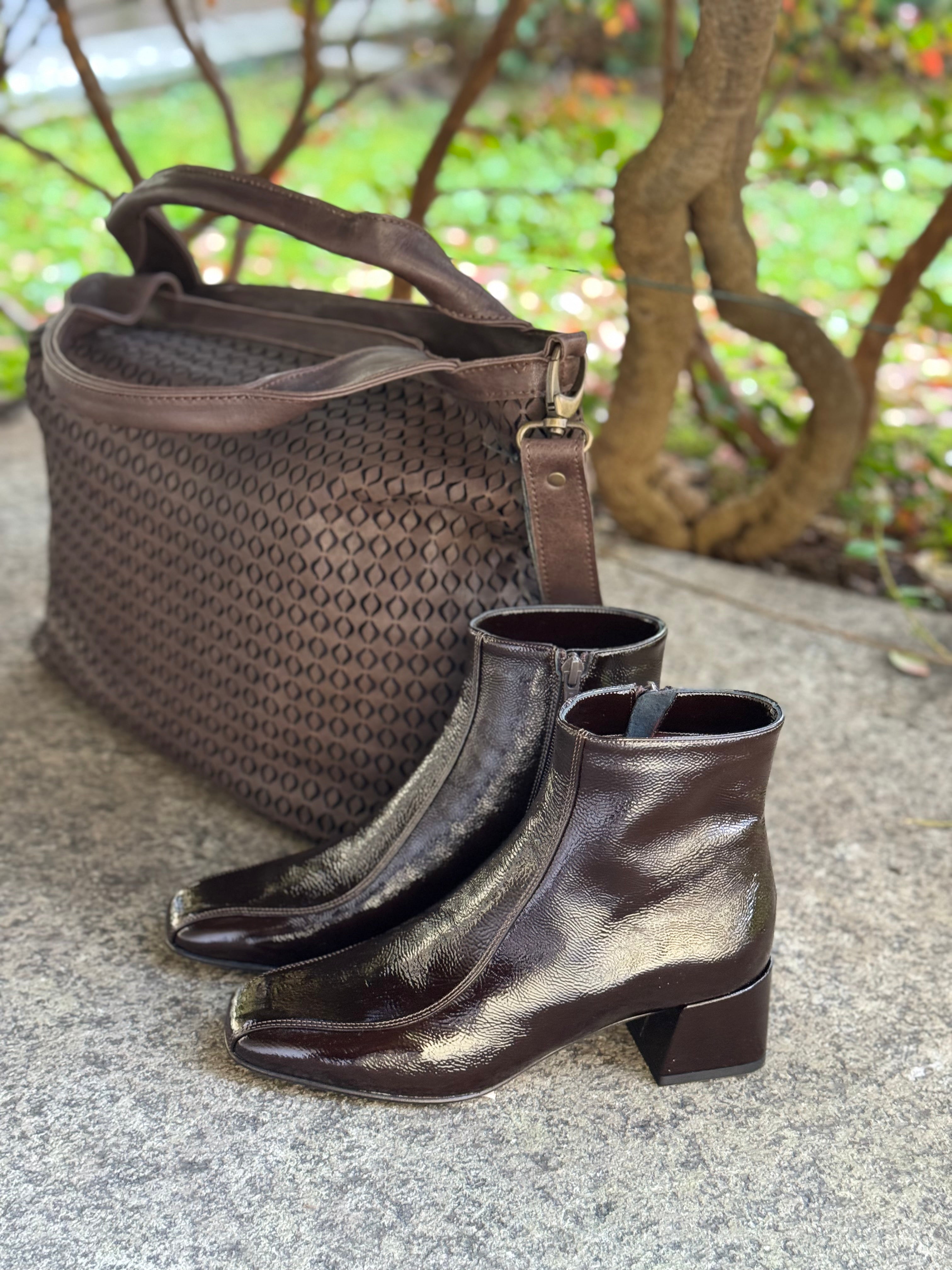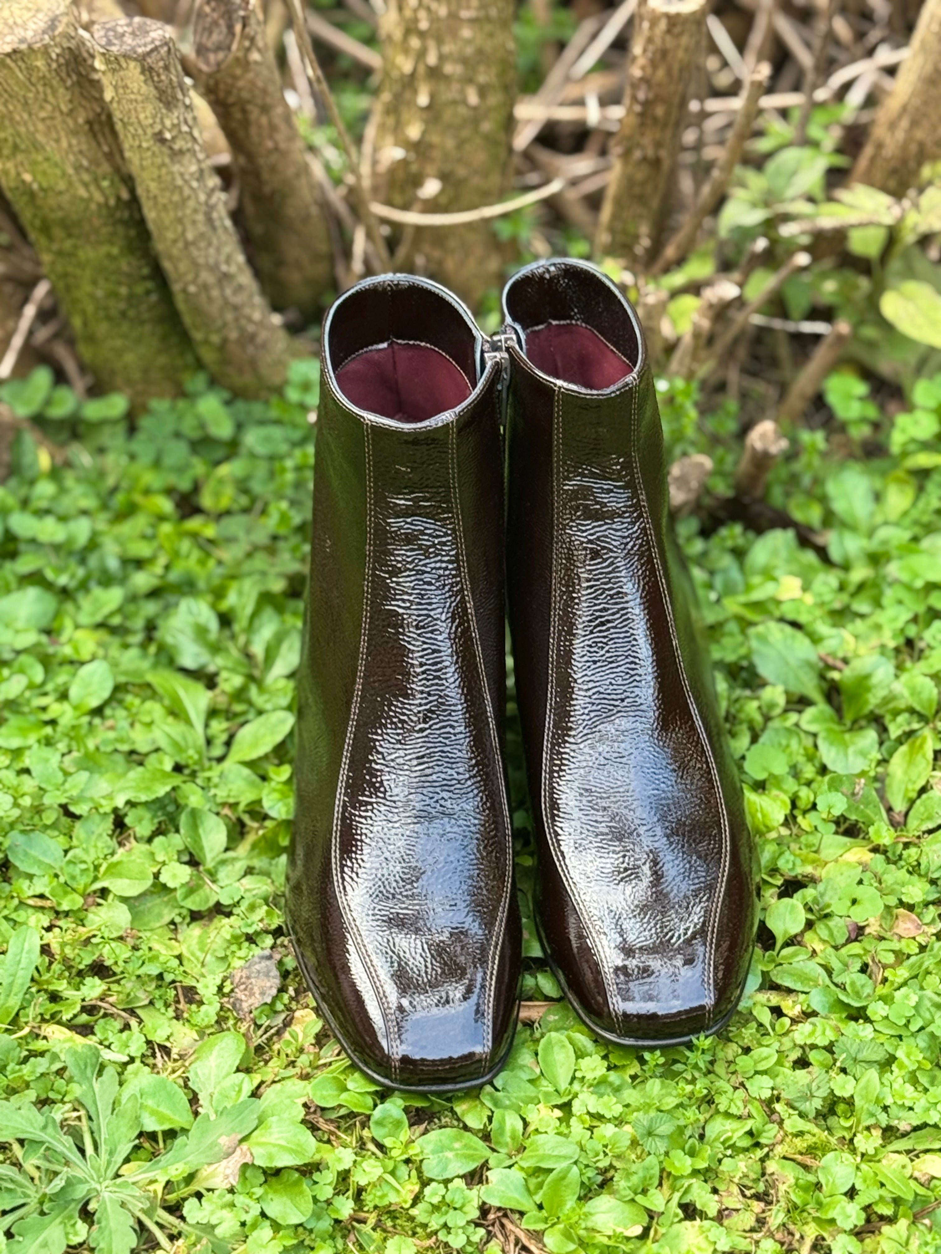 Stivaletto a punta quadrata in vera pelle naplak tabacco con tacco basso 5cm , chiusura con cerniera