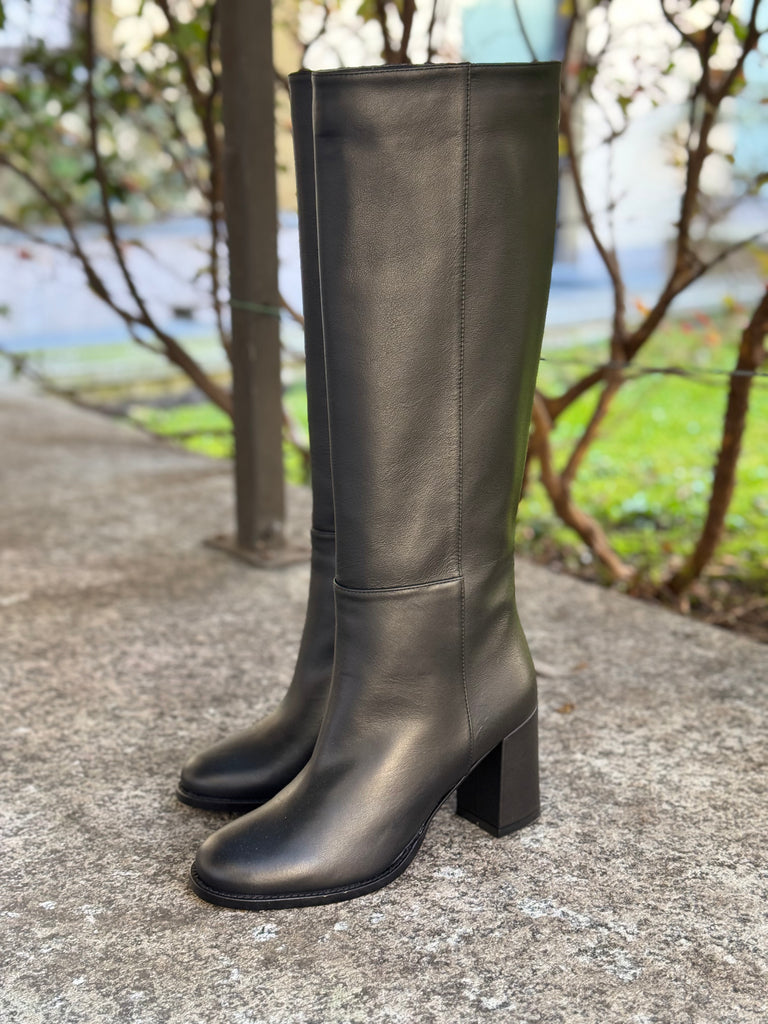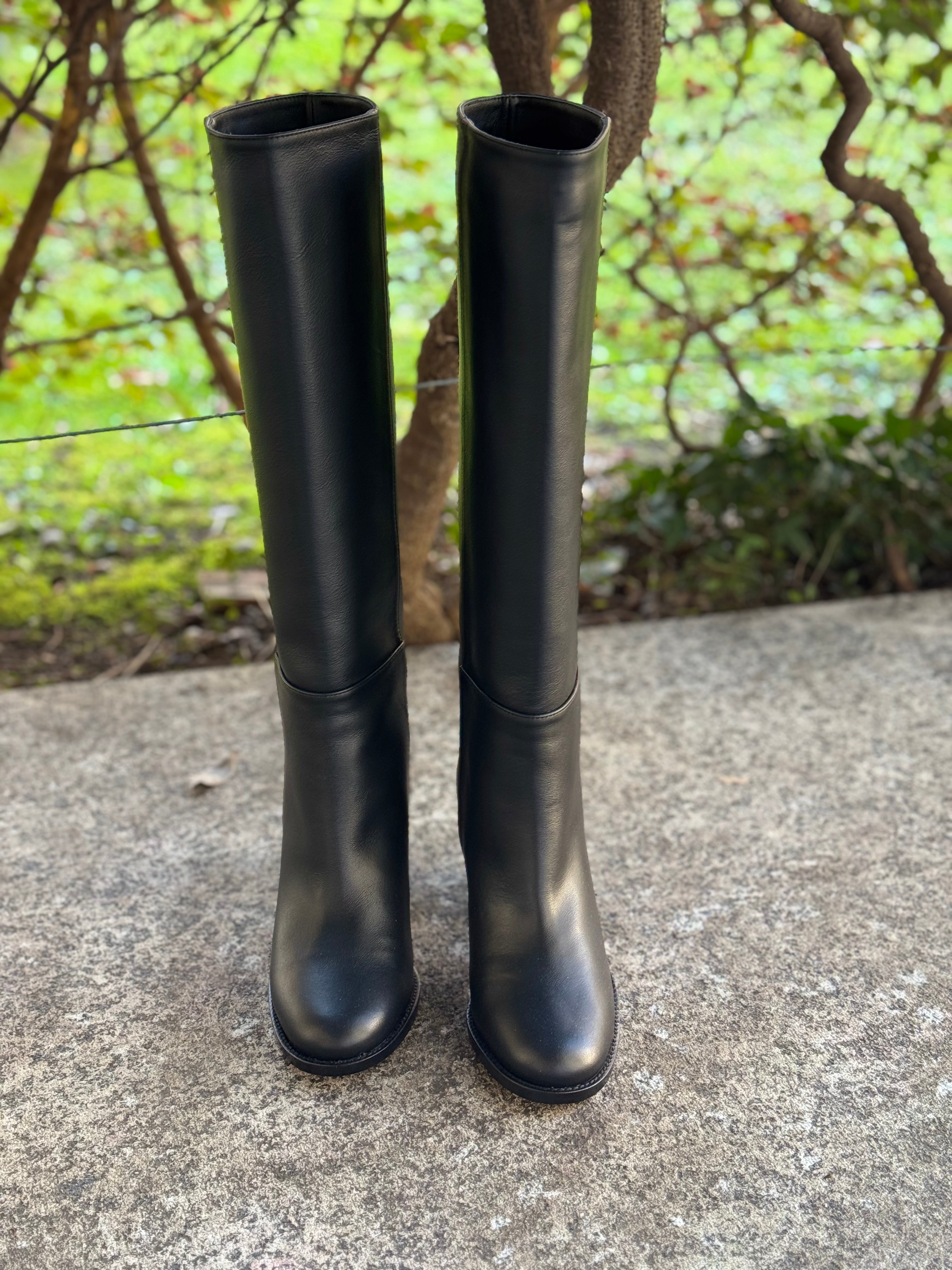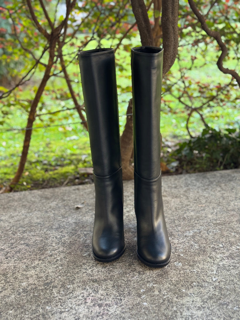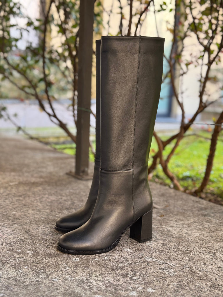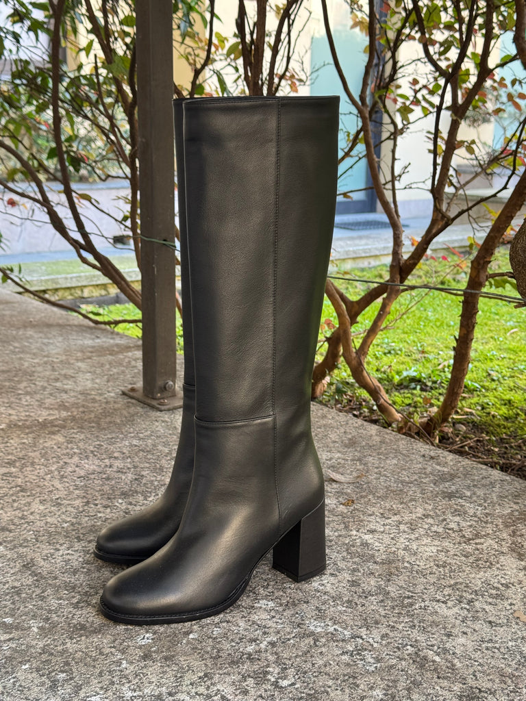 Stivale nero alto col tacco in vera pelle a tubo, lunghezza sotto al ginocchio, suola in vero cuoio. Tacco 7cm - Made in Italy