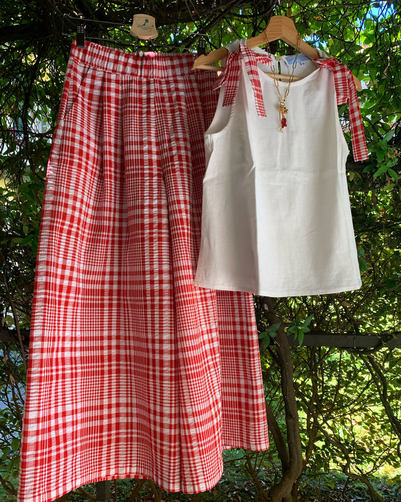 Top svasato, in cotone grezzo bianco con lacci in tessuto check rosso