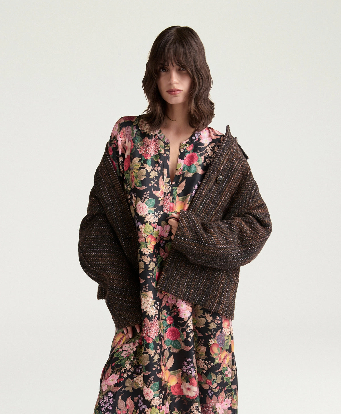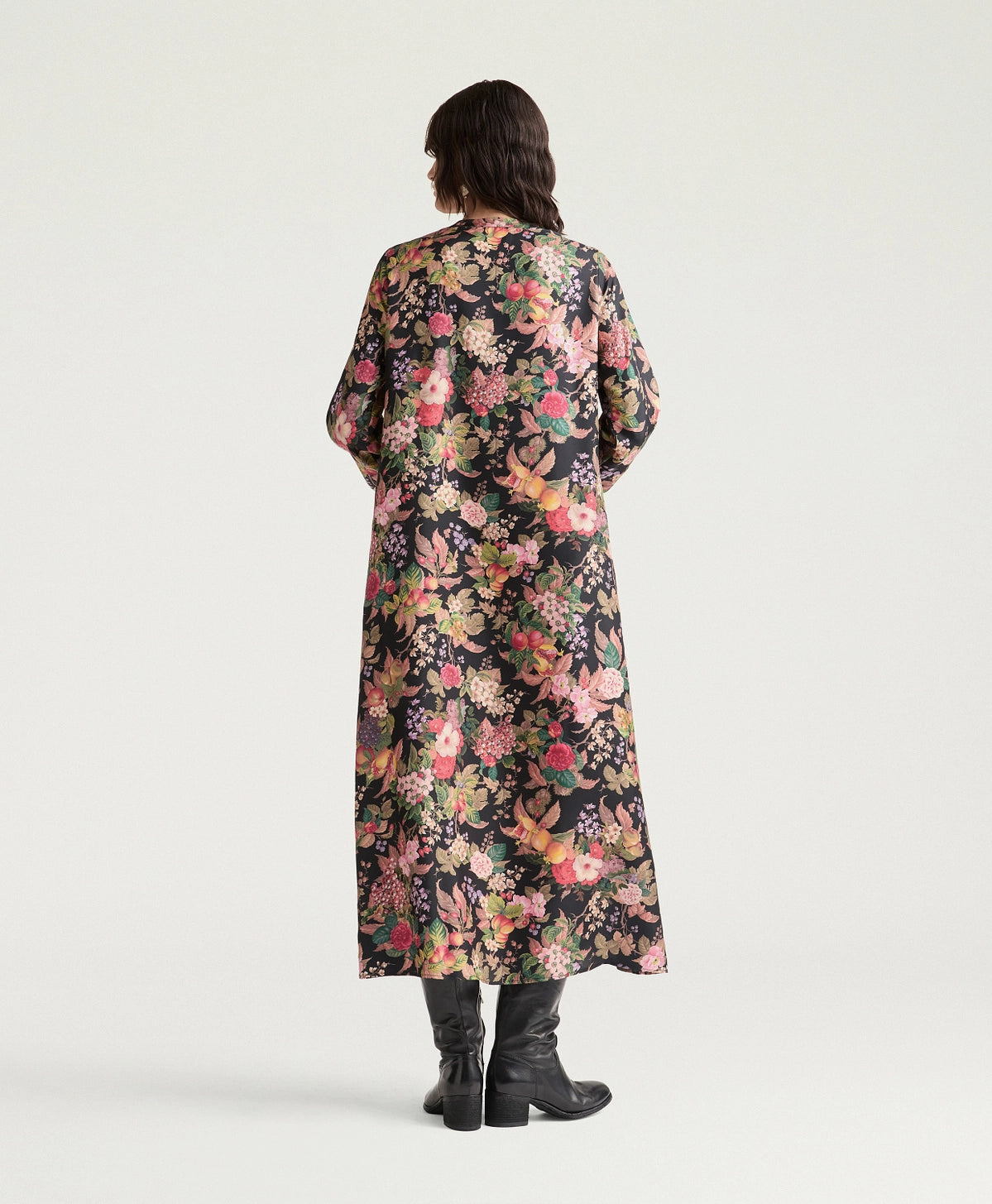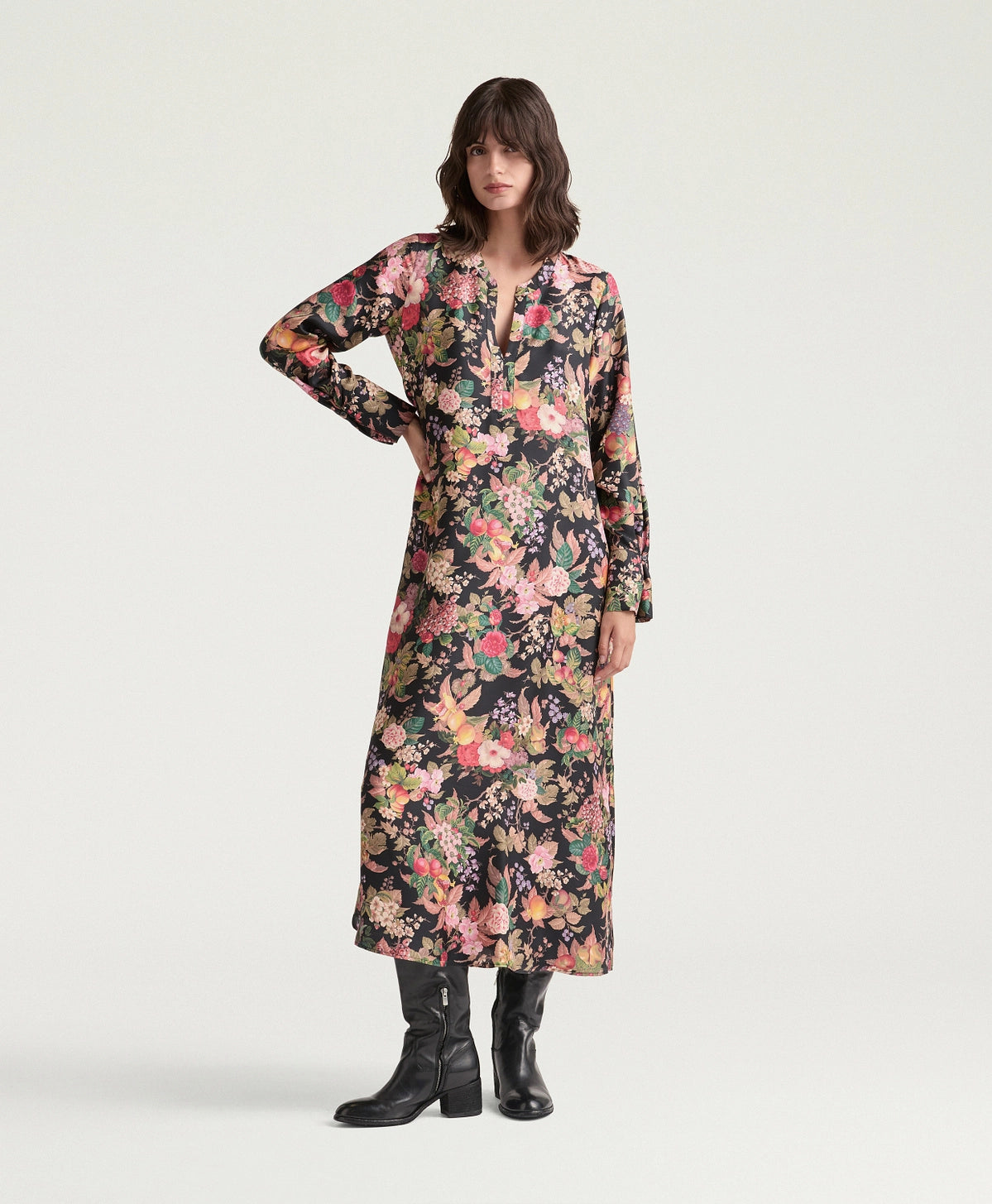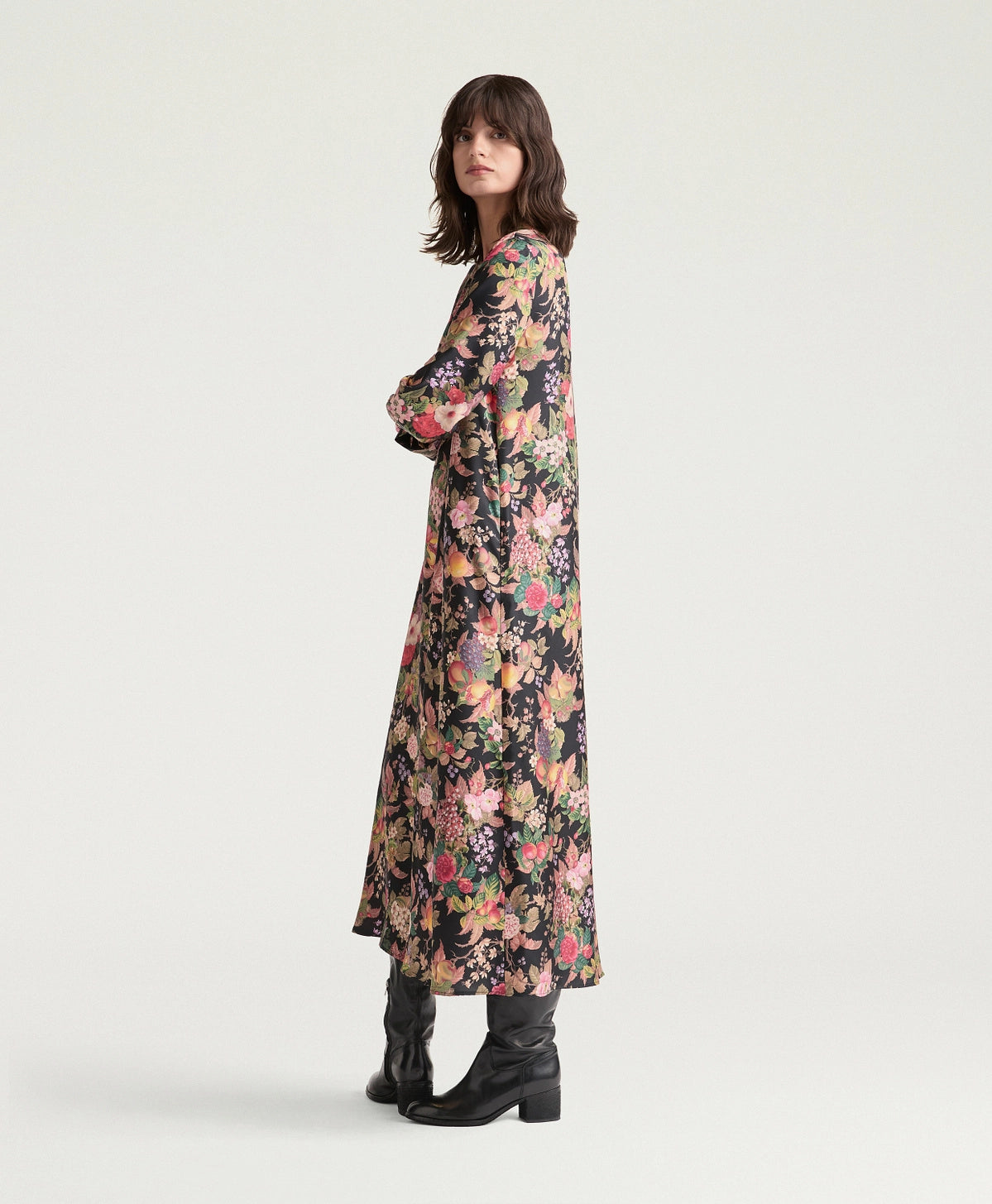 Abito in twill in pura seta stampato, dalla ricca linea svasata. Polsi, tasche e collo alla coreana aperto rendono l’abito femminile e dal carattere deciso.
